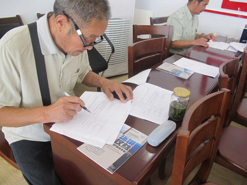 社区居民认真填写《东部地区环境权益维护公众调查问卷》