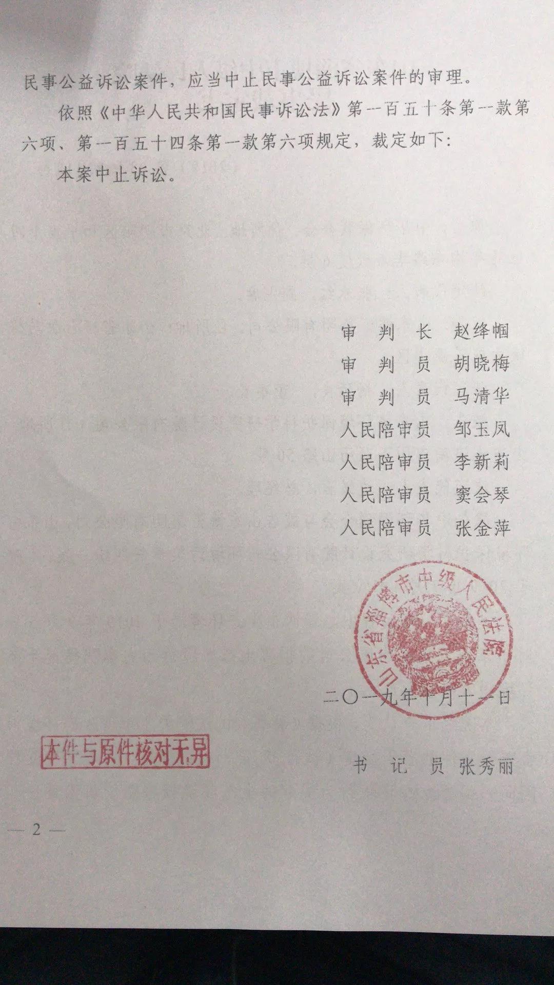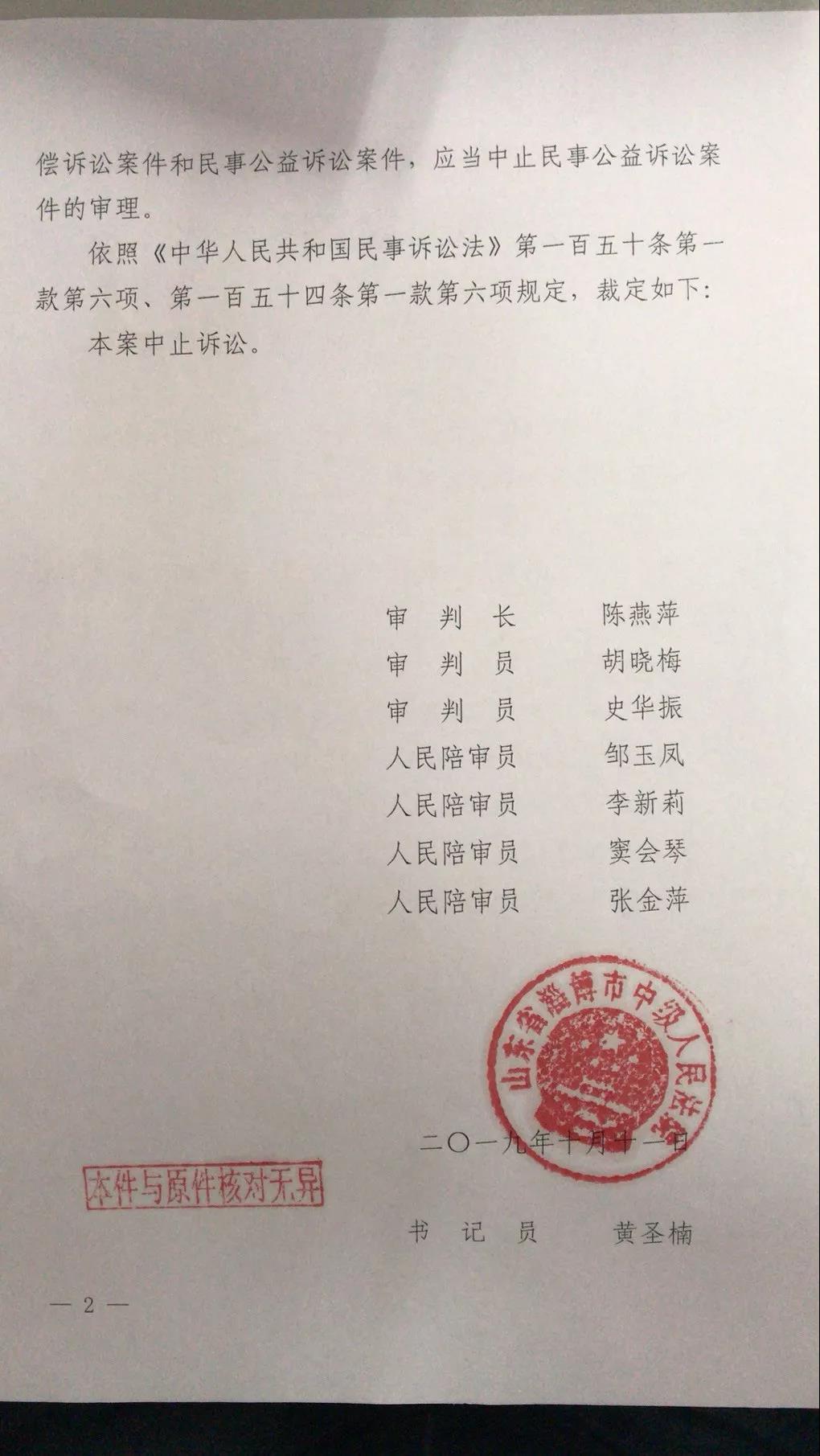 近日,我会收到淄博市中院出具的民事裁定书,以淄博市生态环境局已对博汇集团、辰龙纸业分别提起了生态环境损害赔偿诉讼为由,裁定我会上述两起公益诉讼案件中止诉讼。