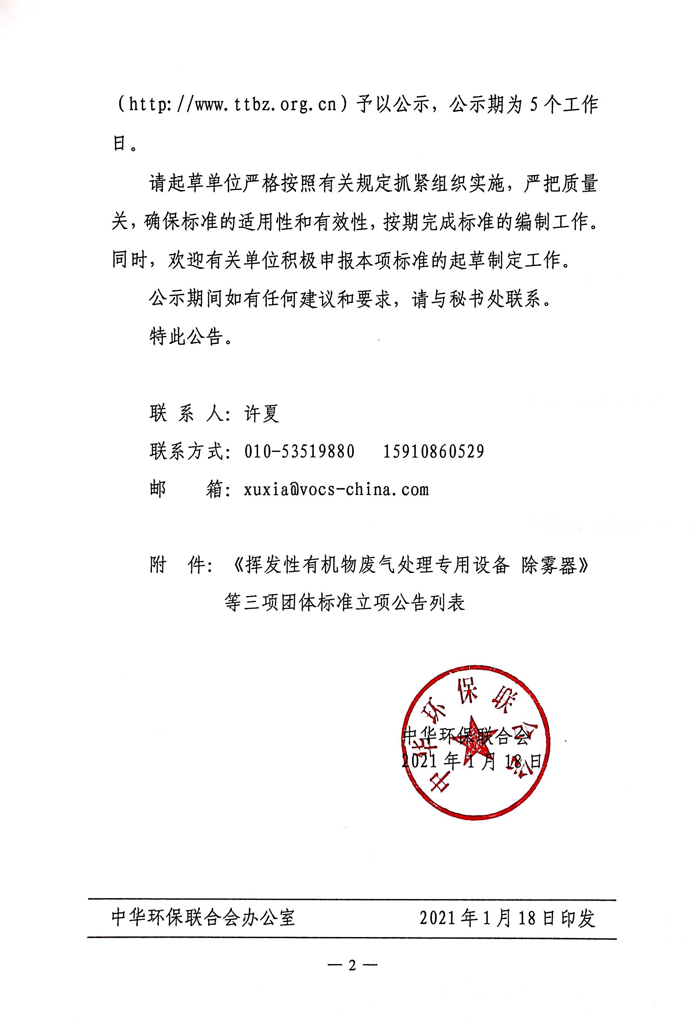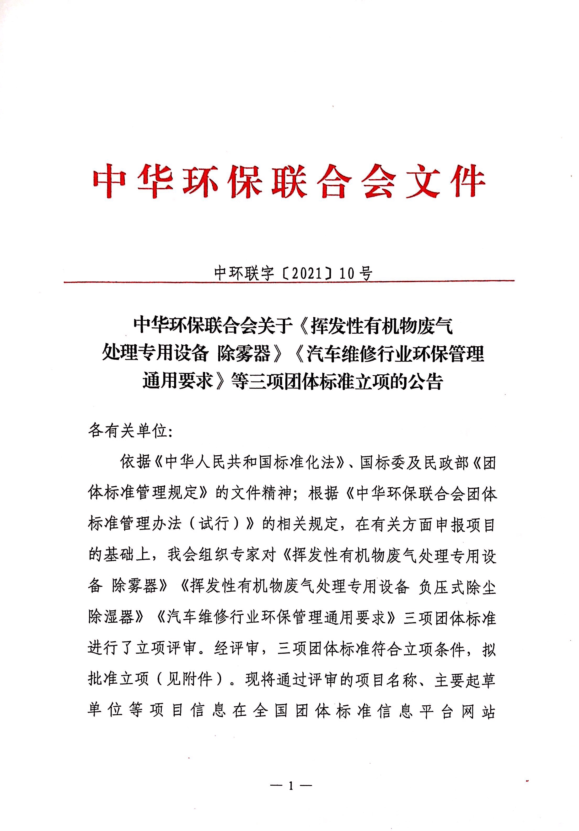 中华环保联合会关于《挥发性有机物废气处理专用设备 除雾器》 《汽车维修行业环保管理通用要求》等三项团体标准立项的公告
