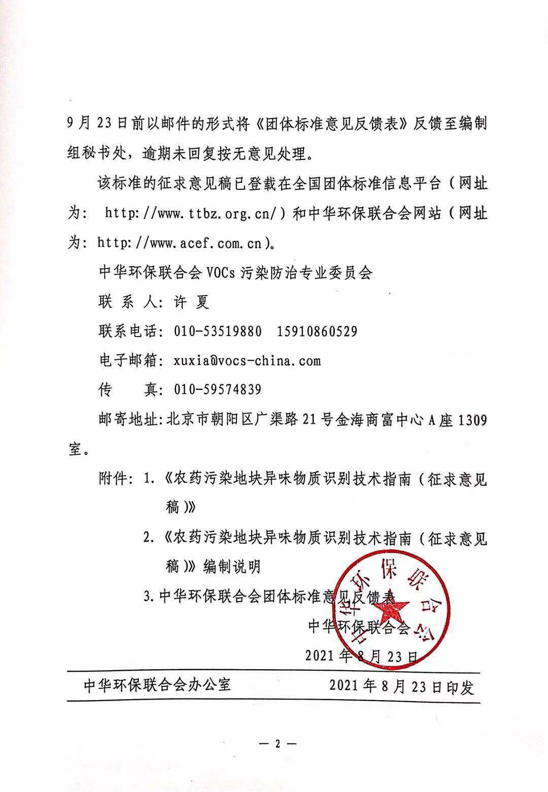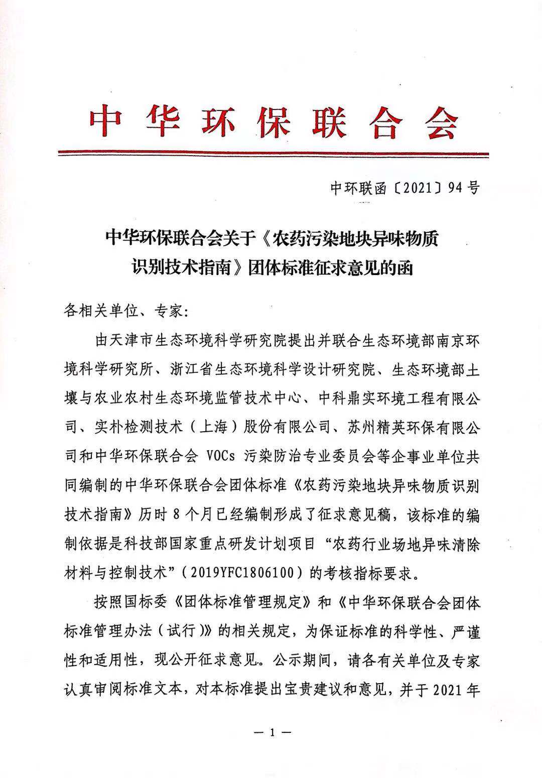关于《农药污染地块异味物质识别技术指南》团体标准征求意见的函