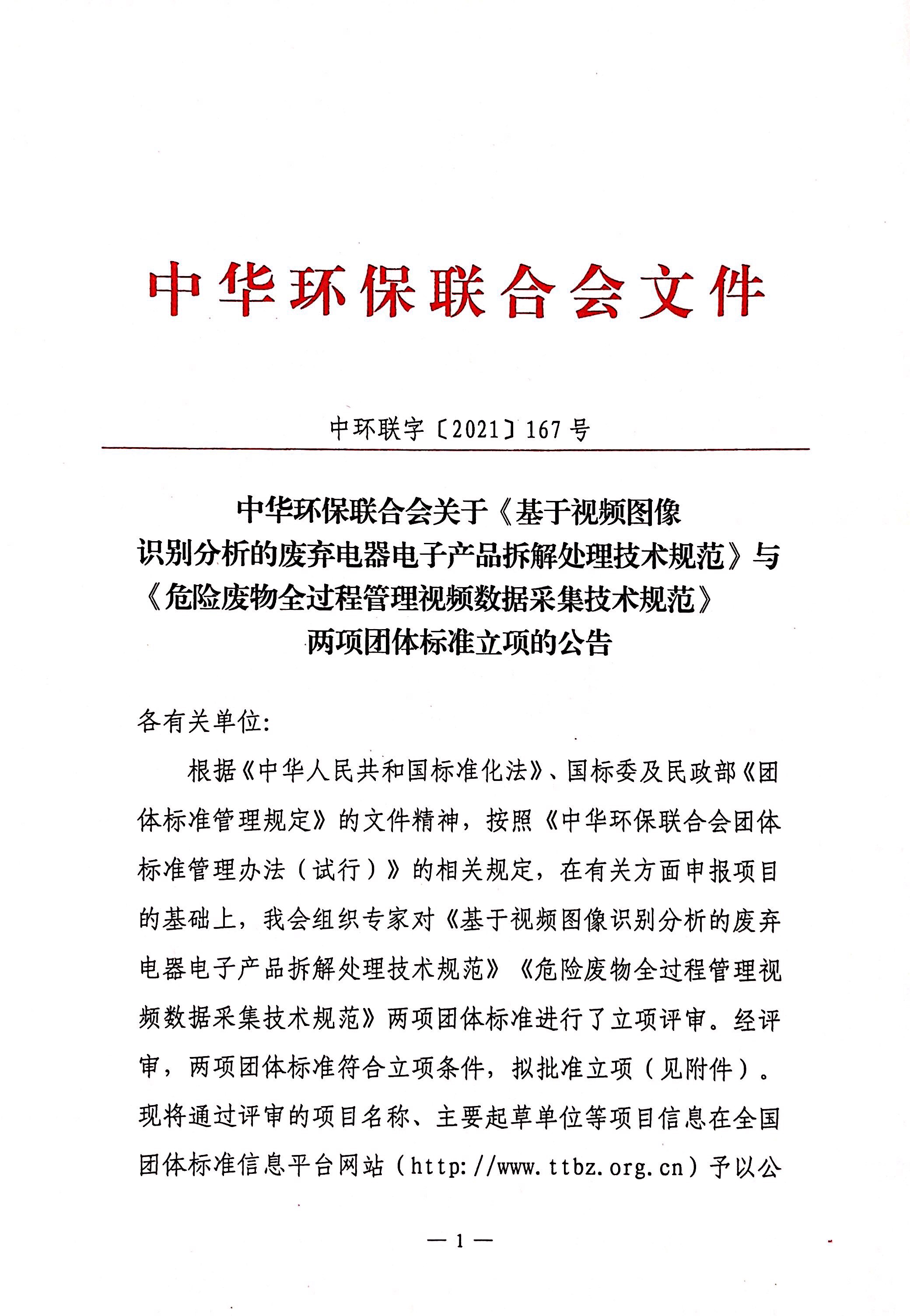 关于《基于视频图像识别分析的废弃电器电子产品拆解处理技术规范》与《危险废物全过程管理视频数据采集技术规范》 两项团体标准立项的公告