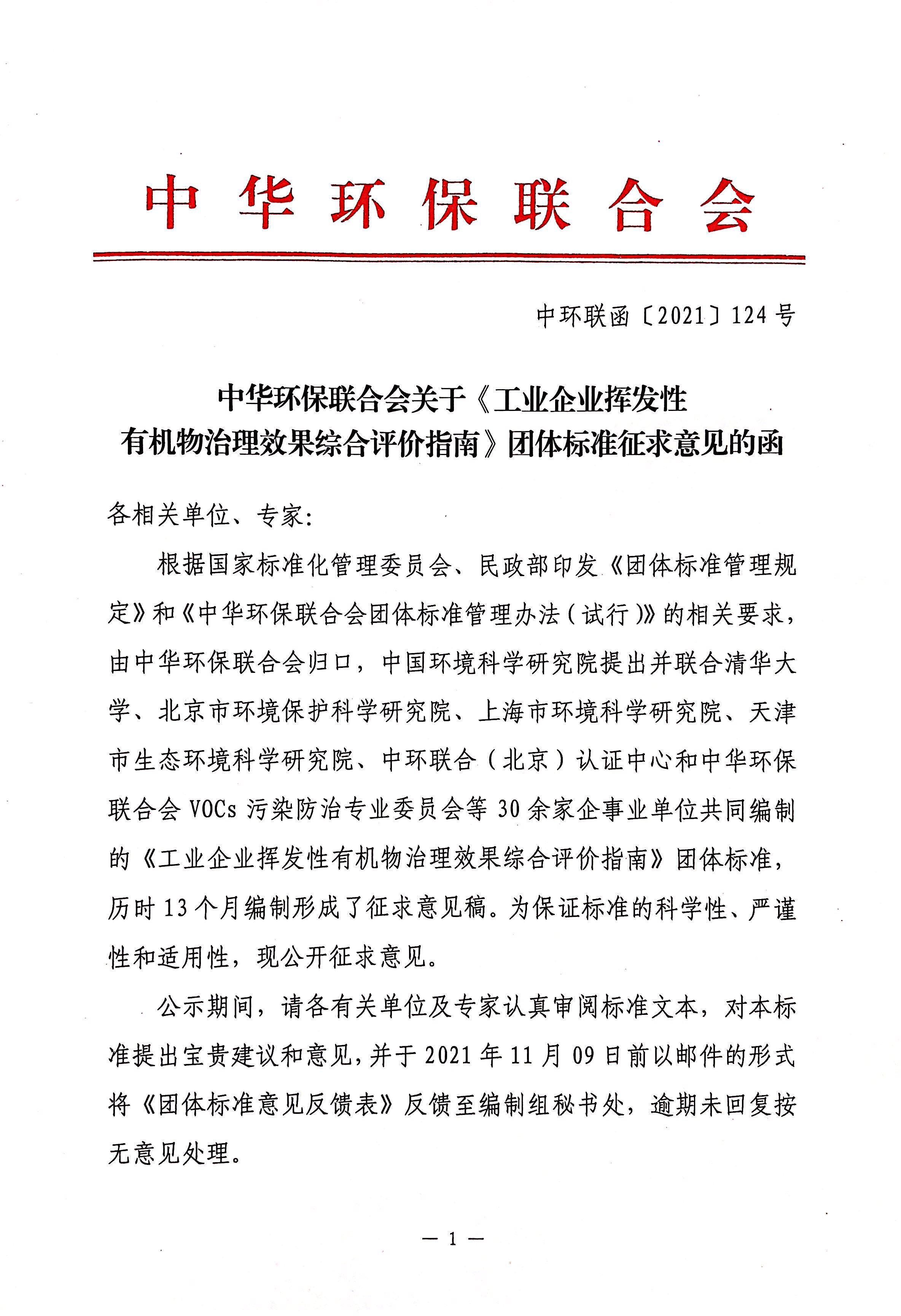 关于《工业企业挥发性有机物治理效果综合评价指南》团体标准征求意见的函