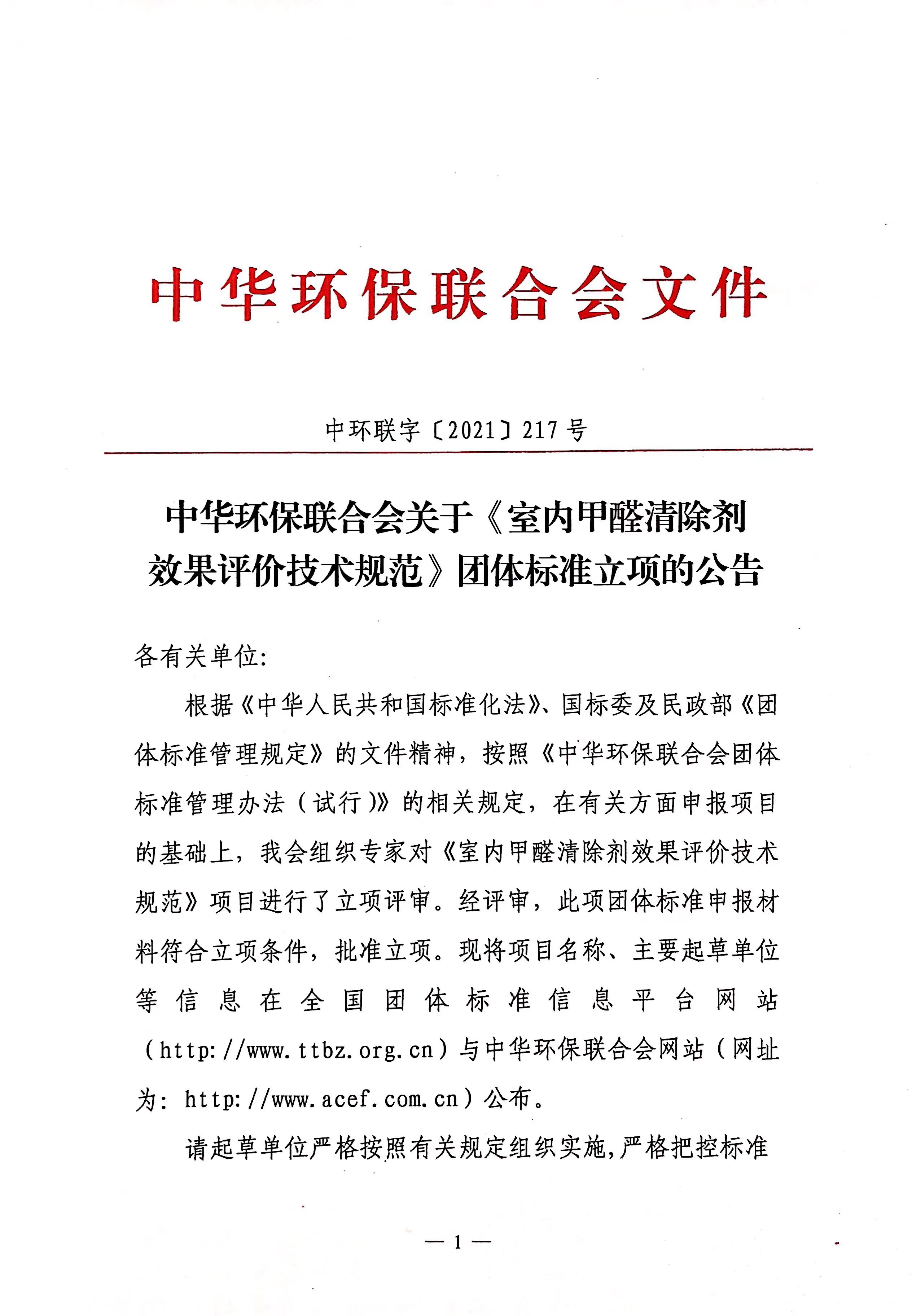 关于《室内甲醛清除剂效果评价技术规范》团体标准立项的公告