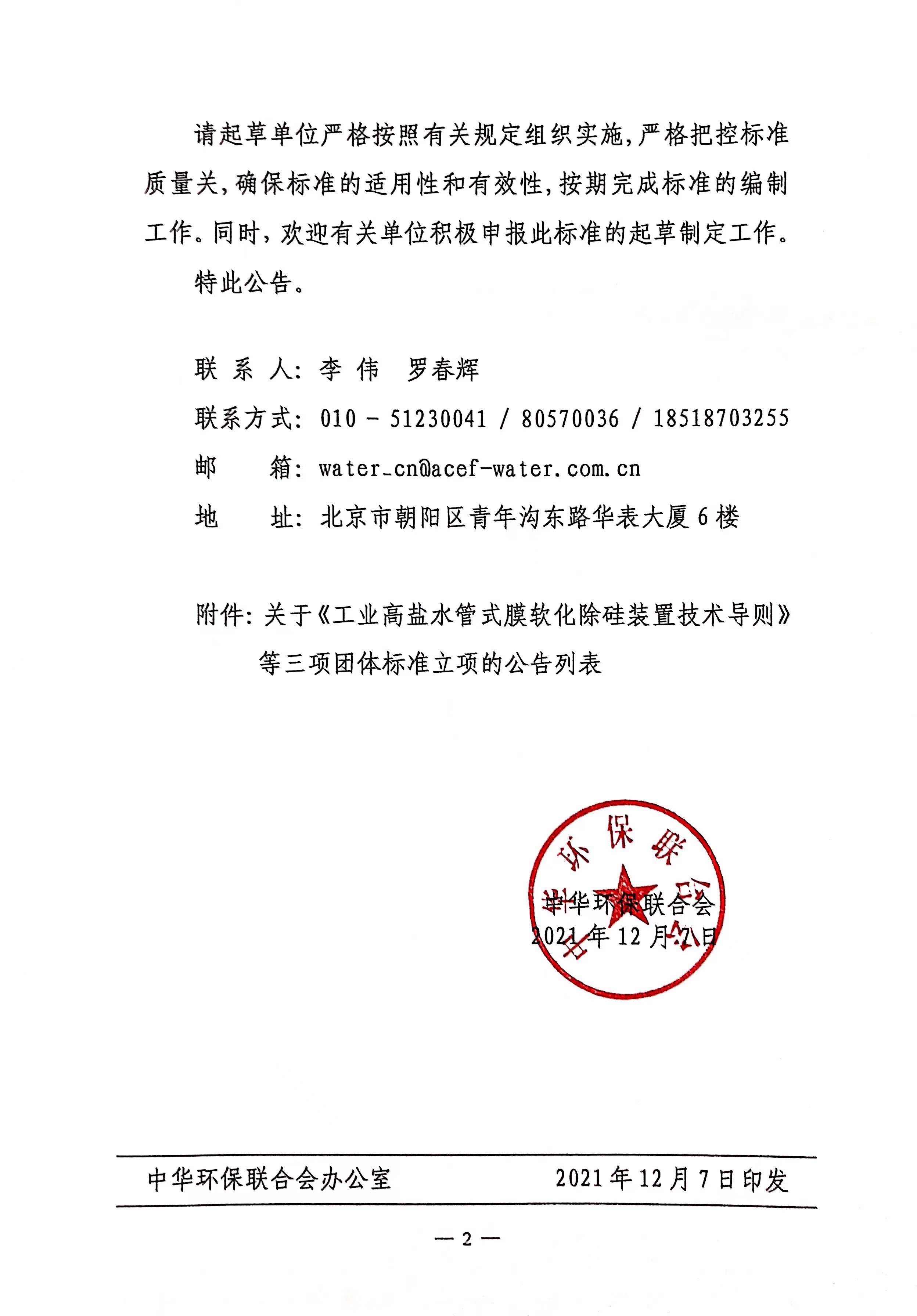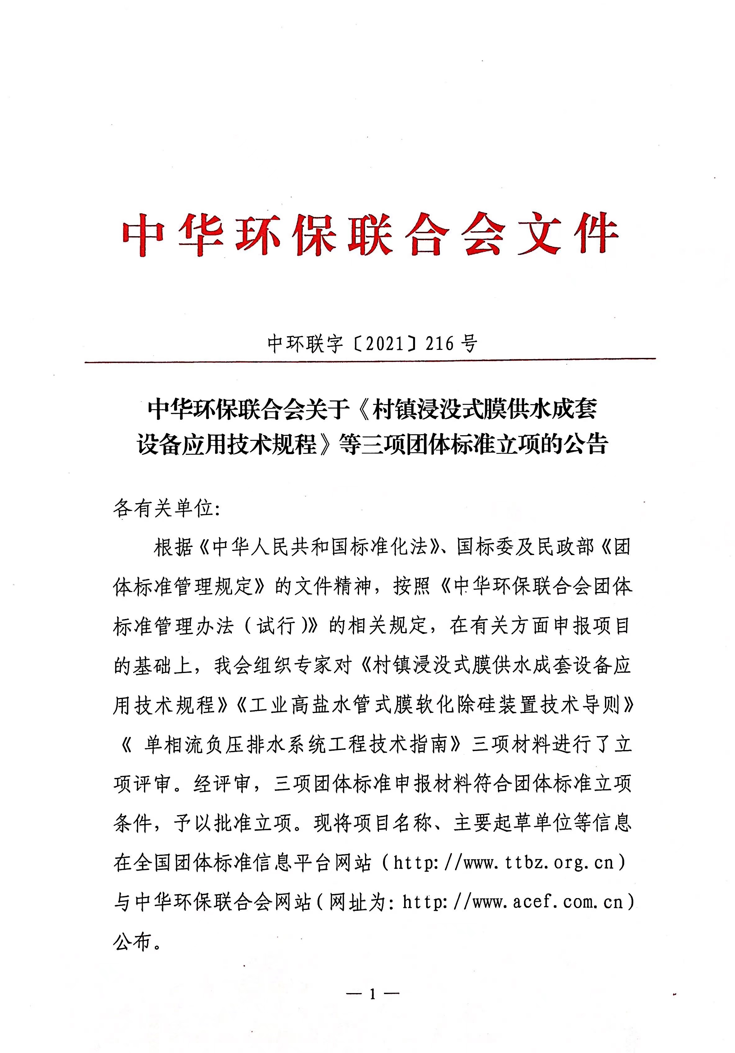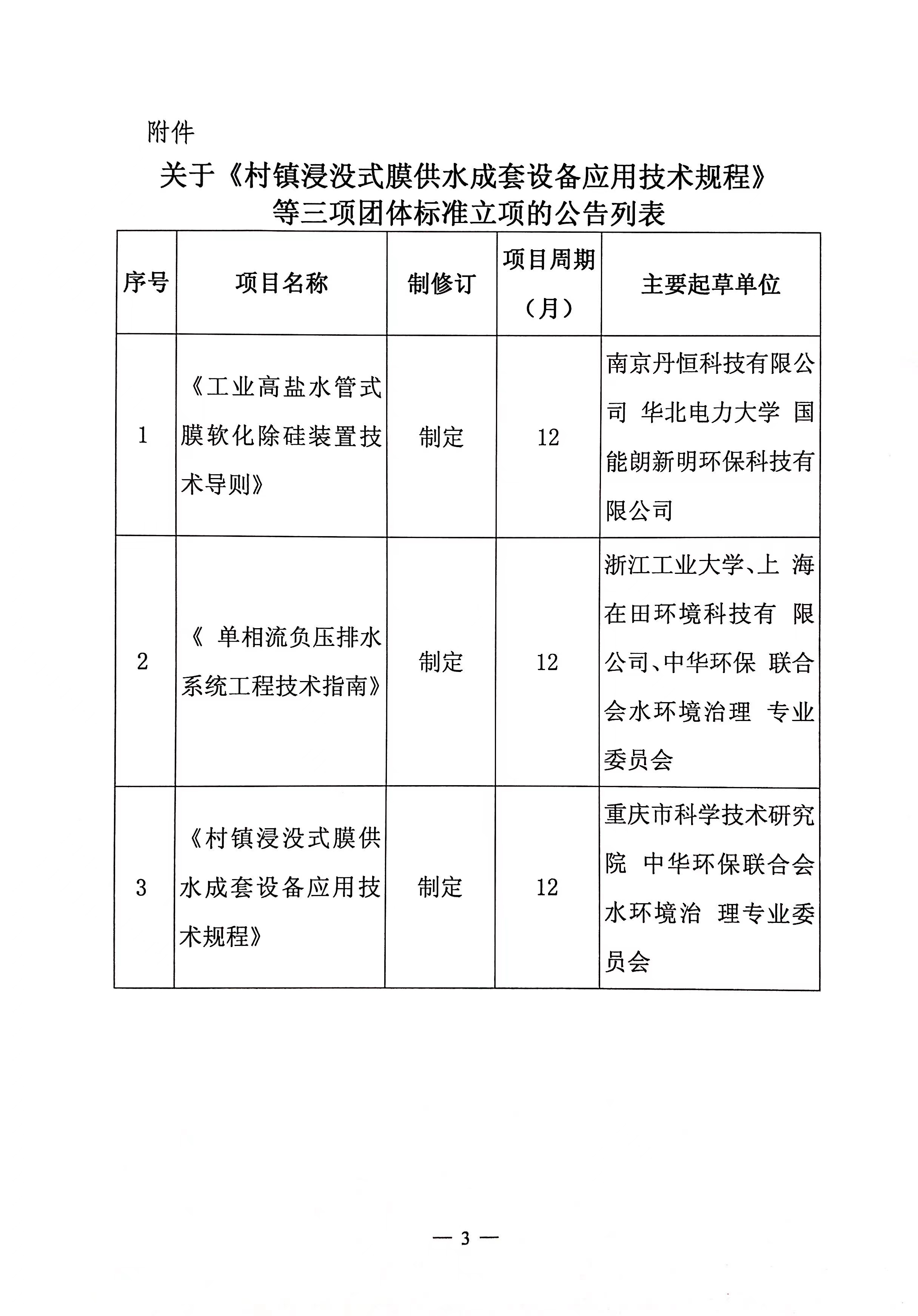 关于《村镇浸没式膜供水成套设备应用技术规程》等三项团体标准立项的公告