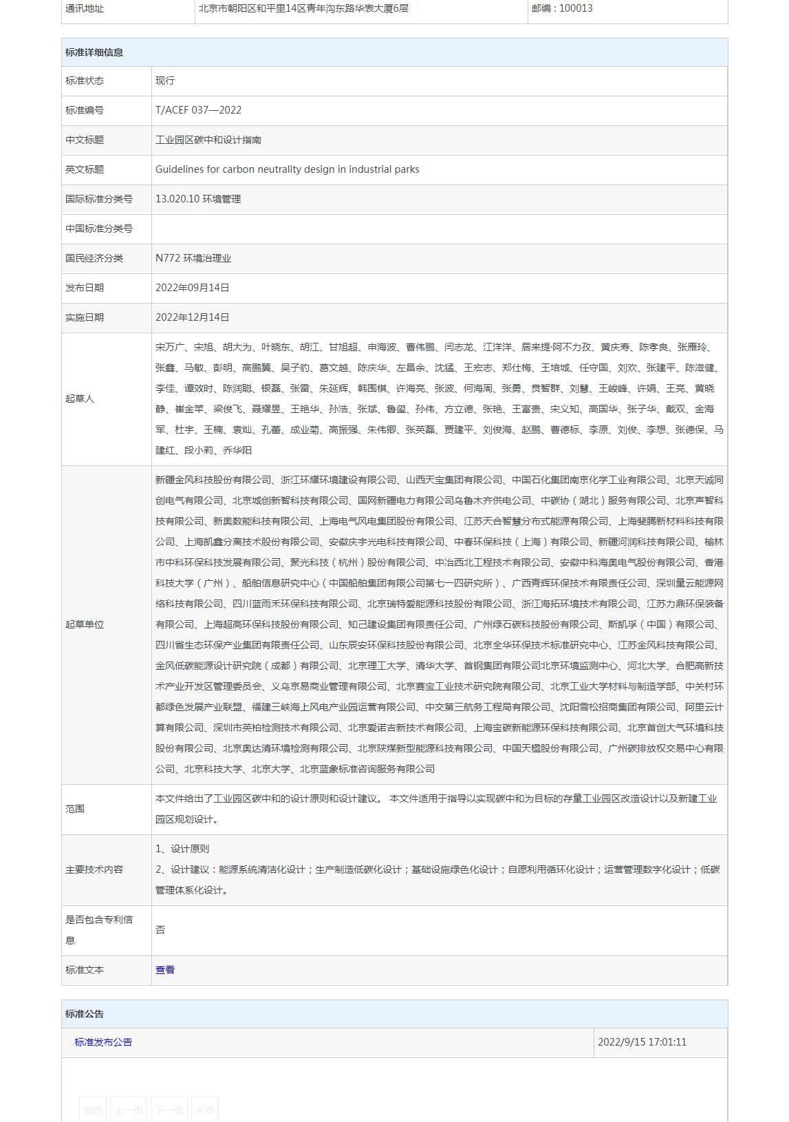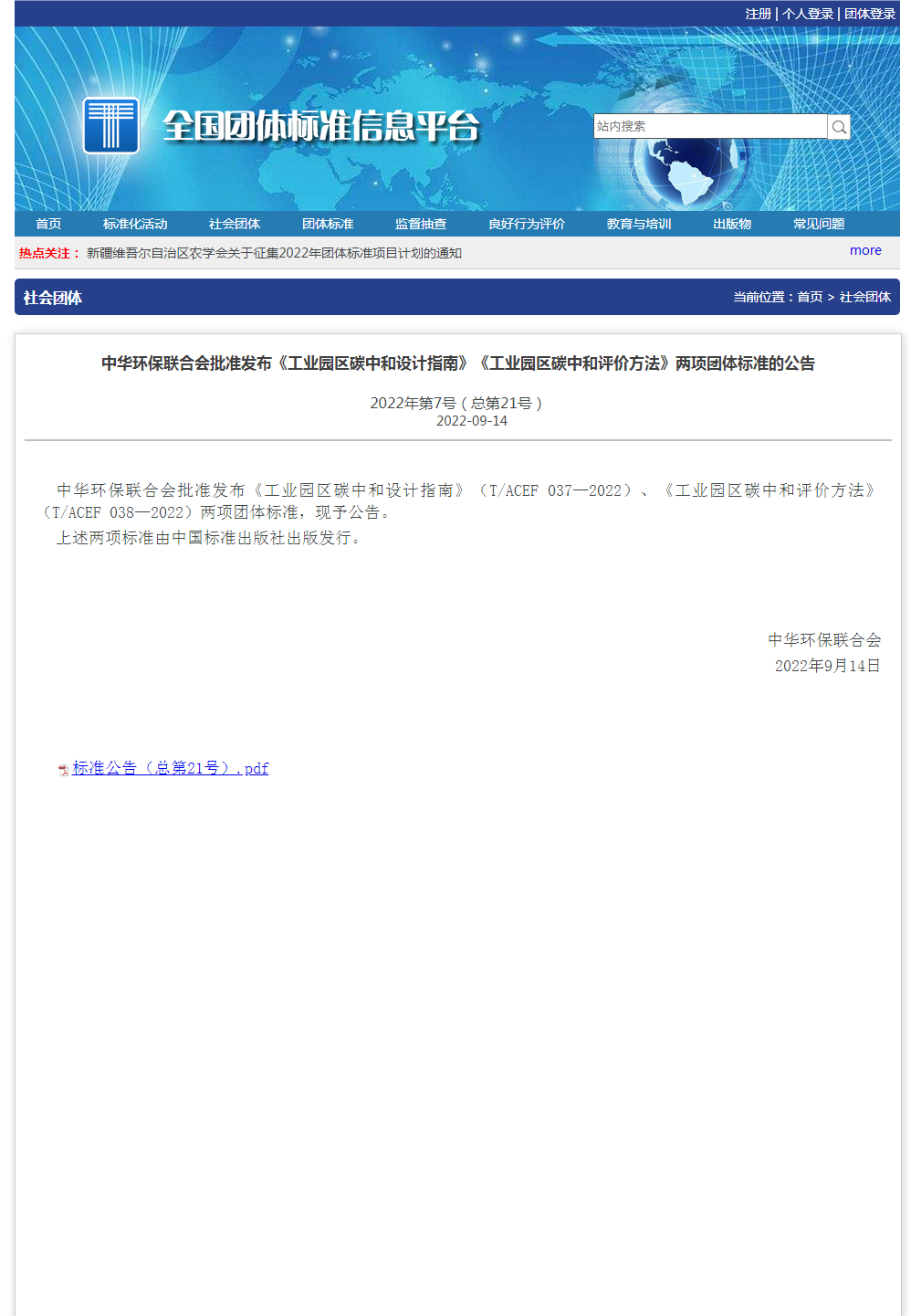 日前,根据《中华人民共和国标准化法》以及国家标准化管理委员会、民政部联合制定的《团体标准管理规定》,依据全国团体标准信息平台和《中华环保联合会团体标准管理办法(试行)》相关要求,《工业园区碳中和设计指南》(T/ACEF 037—2022)和《工业园区碳中和评价方法》(T/ACEF 038—2022)经中华环保联合会批准于2022年9月14日正式发布,自2022年12月14日起实施,标准文本已在全国团体标准信息平台进行发布。