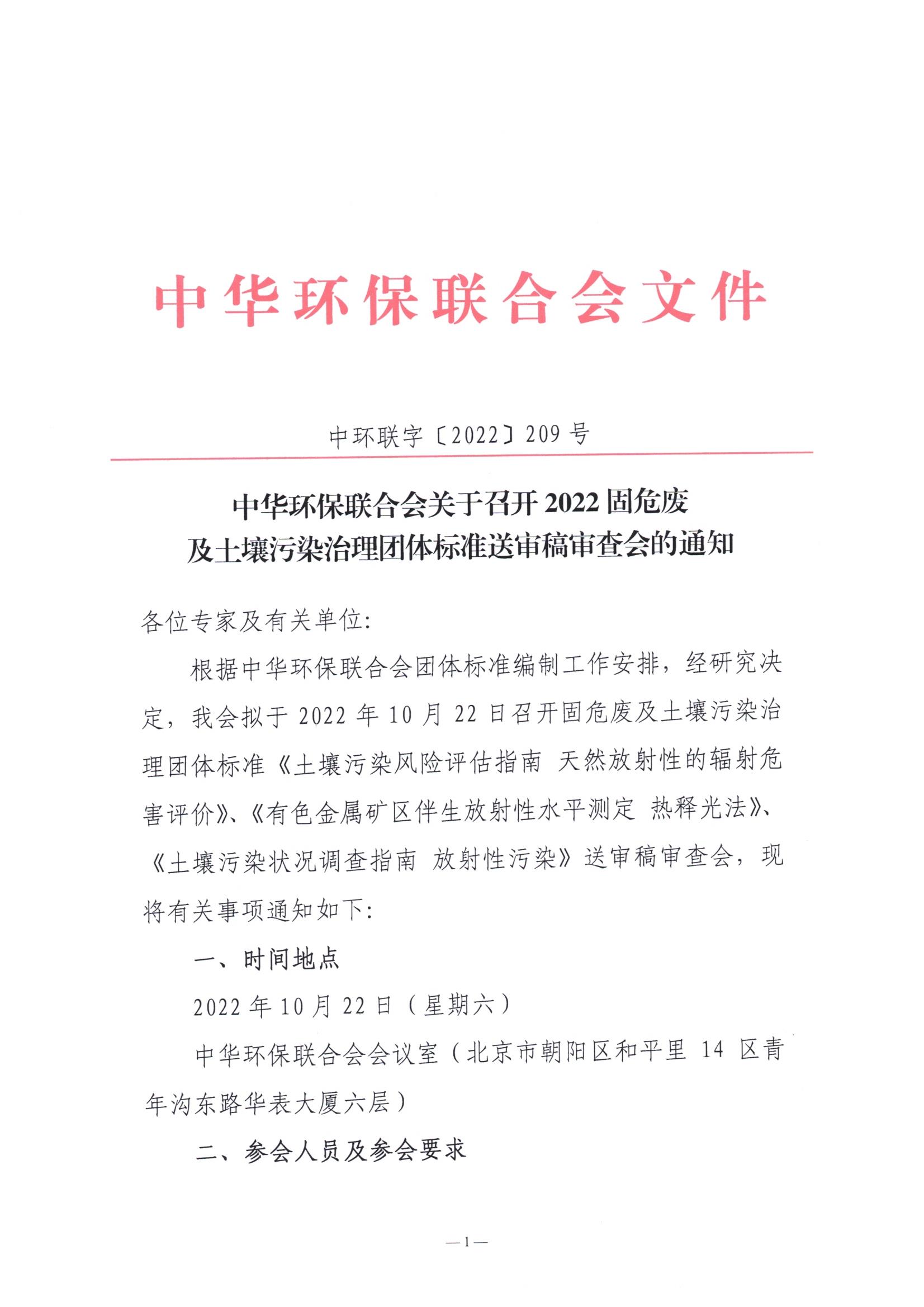 中华环保联合会关于召开2022固危废及土壤污染治理团体标准送审稿审查会的通知