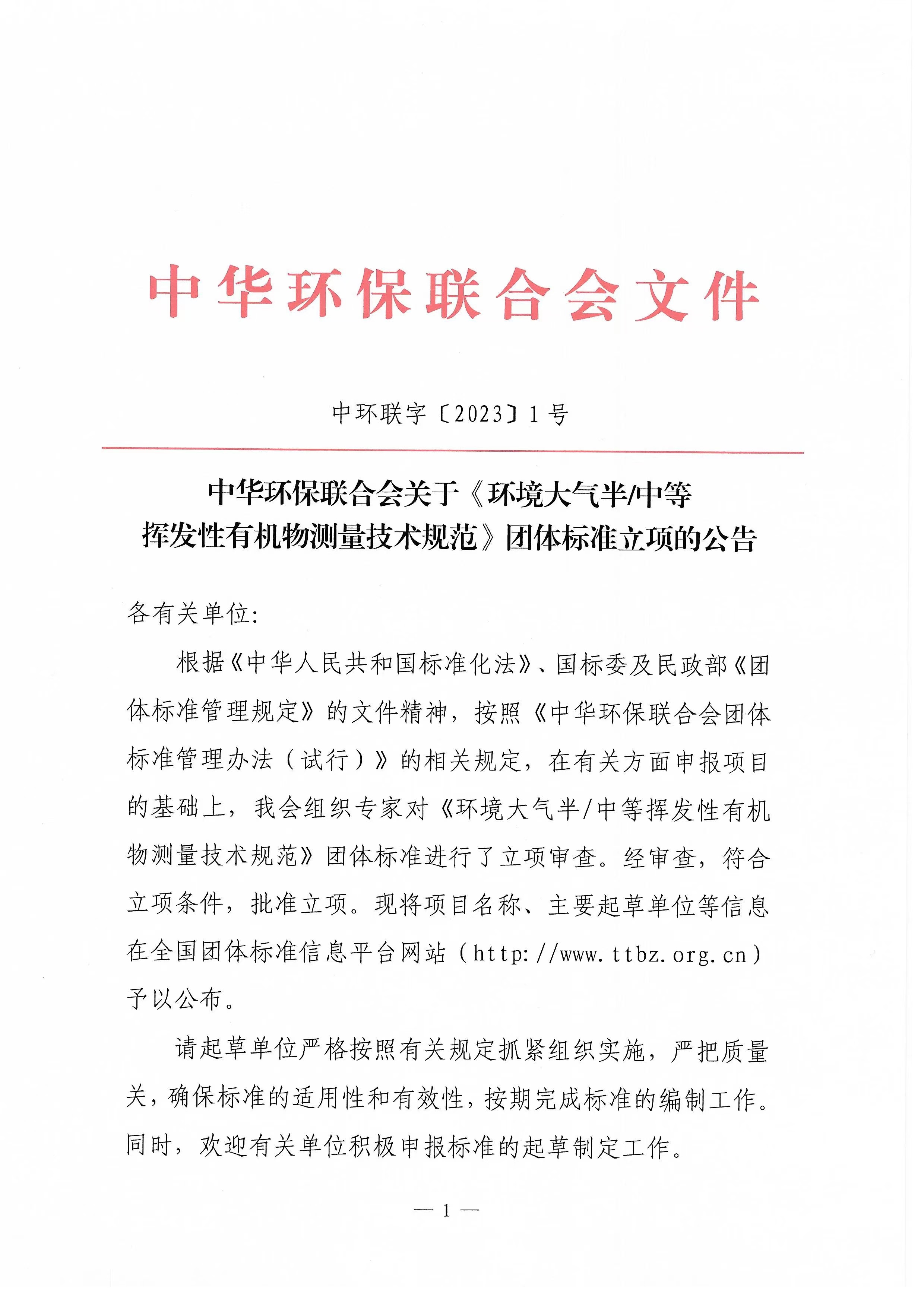 中华环保联合会关于《环境大气半/中等挥发性有机物测量技术规范》 团体标准立项的公告