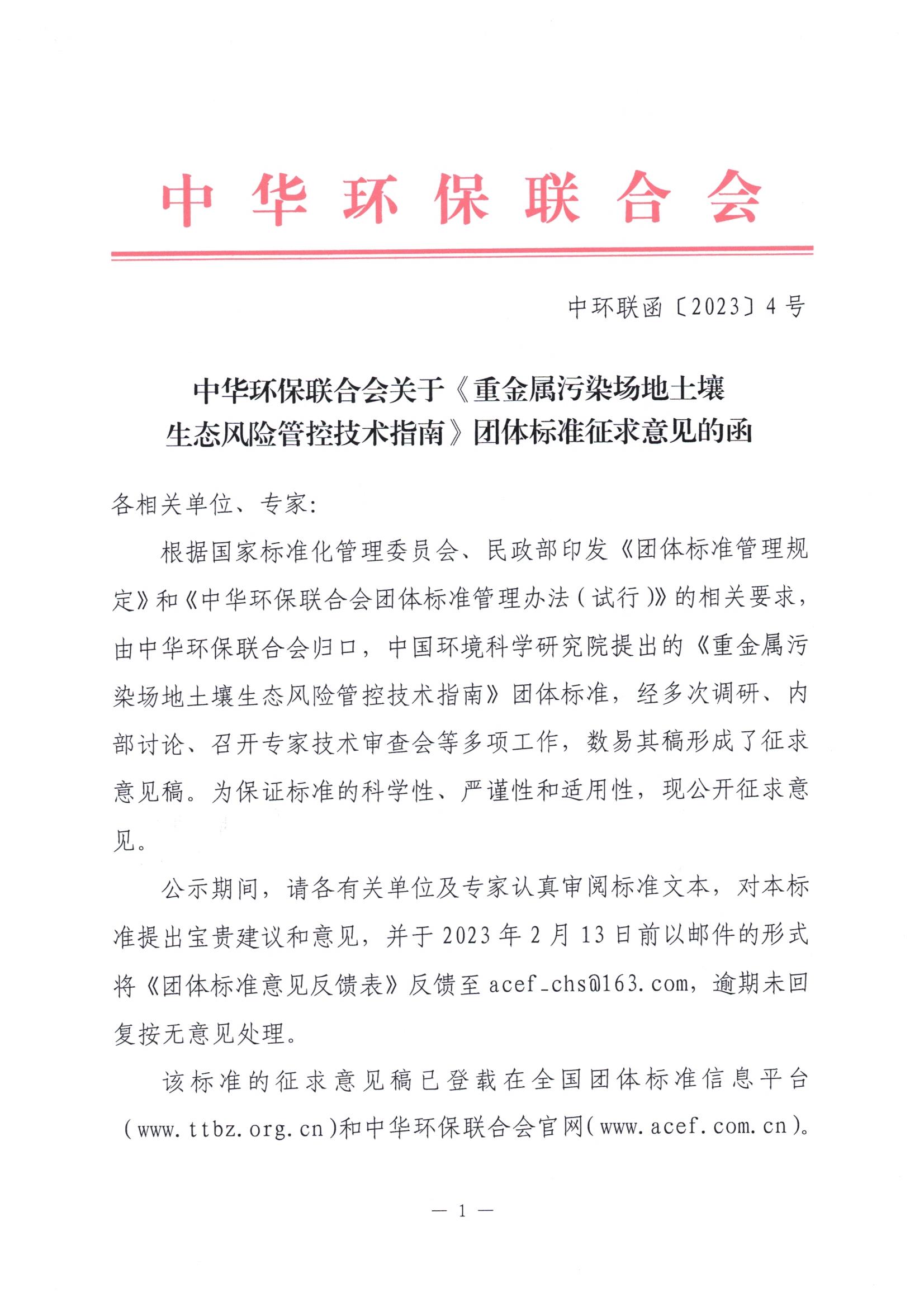 关于《重金属污染场地土壤生态风险管控技术指南》团体标准征求意见的函