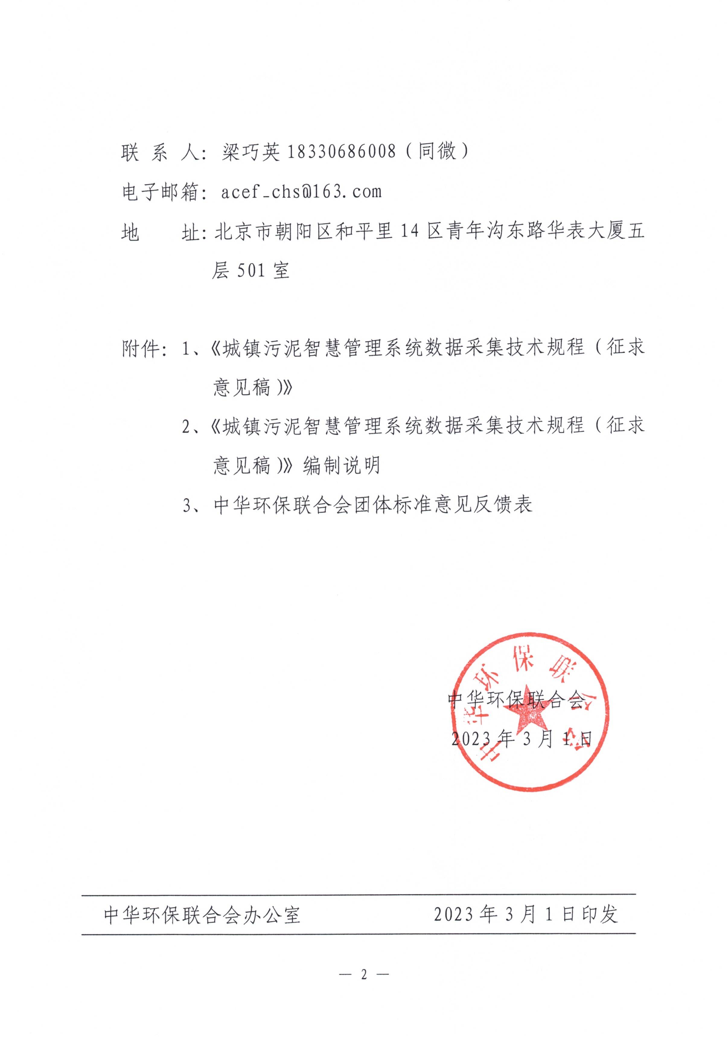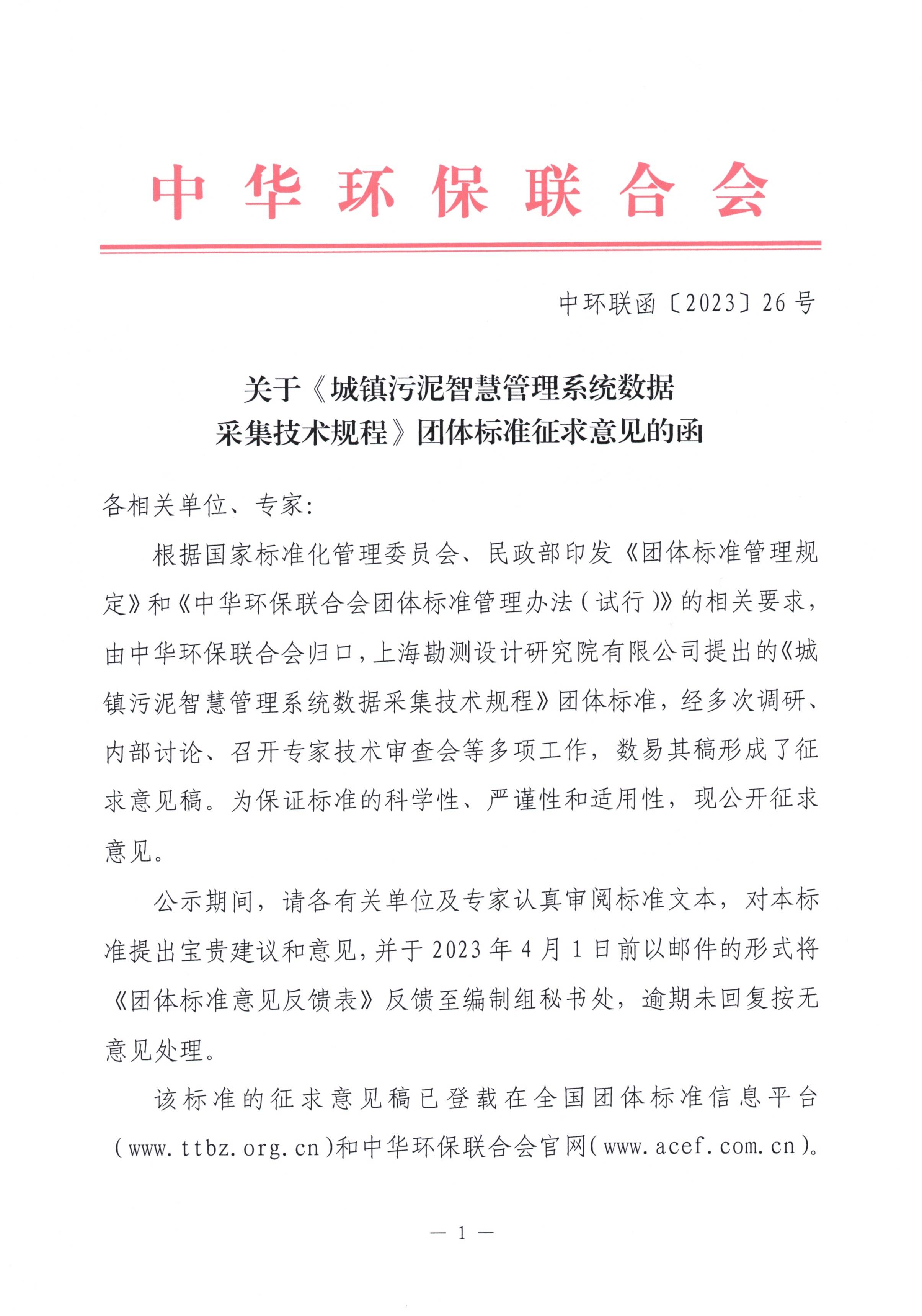 关于《城镇污泥智慧管理系统数据采集技术规程》团体标准征求意见的函