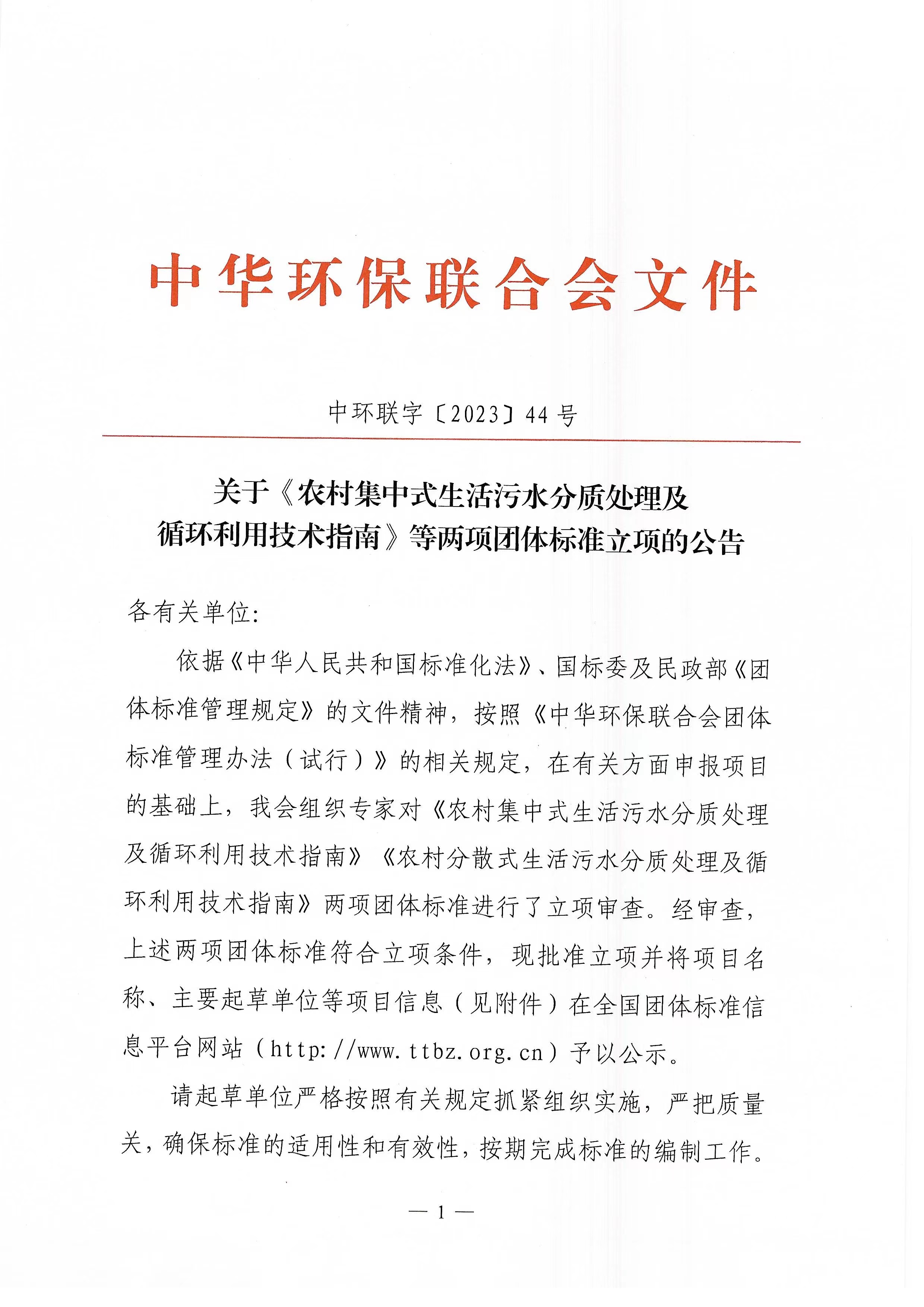 关于《农村集中式生活污水分质处理及循环利用技术指南》等两项团体标准立项的公告