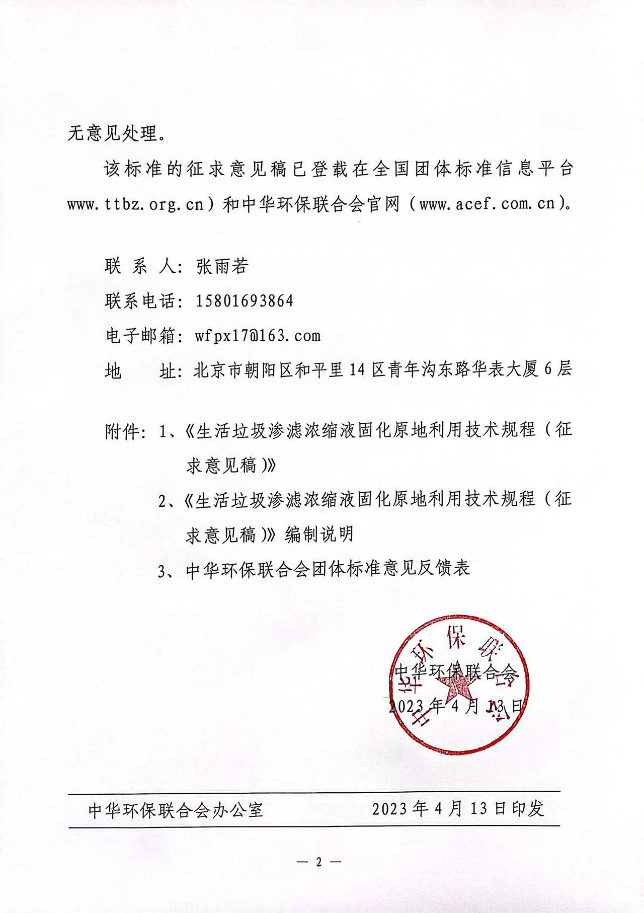 关于《生活垃圾渗滤浓缩液固化原地利用技术规程》团体标准征求意见的函