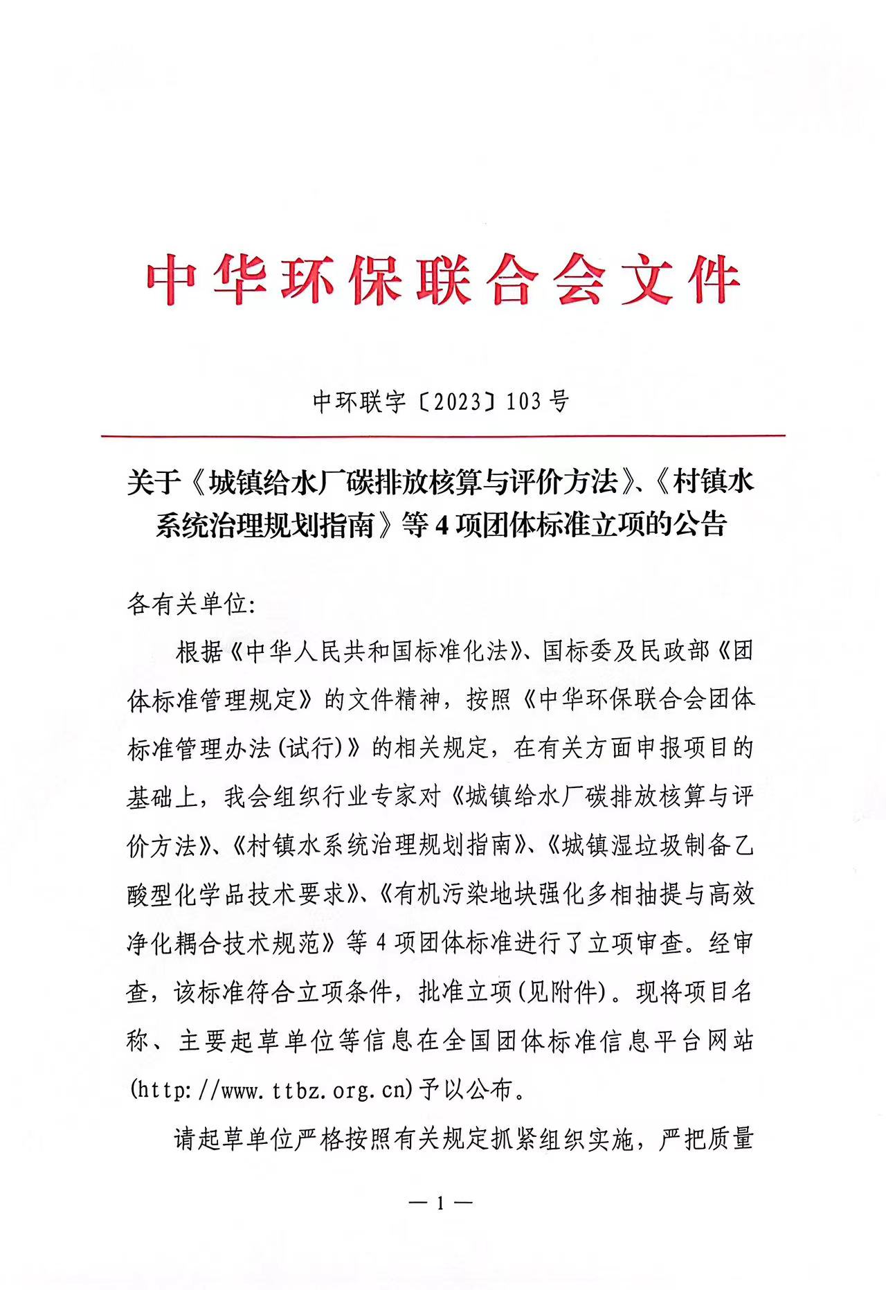 关于《城镇给水厂碳排放核算与评价方法》、《村镇水系统治理规划指南》等4项团体标准立项的公告