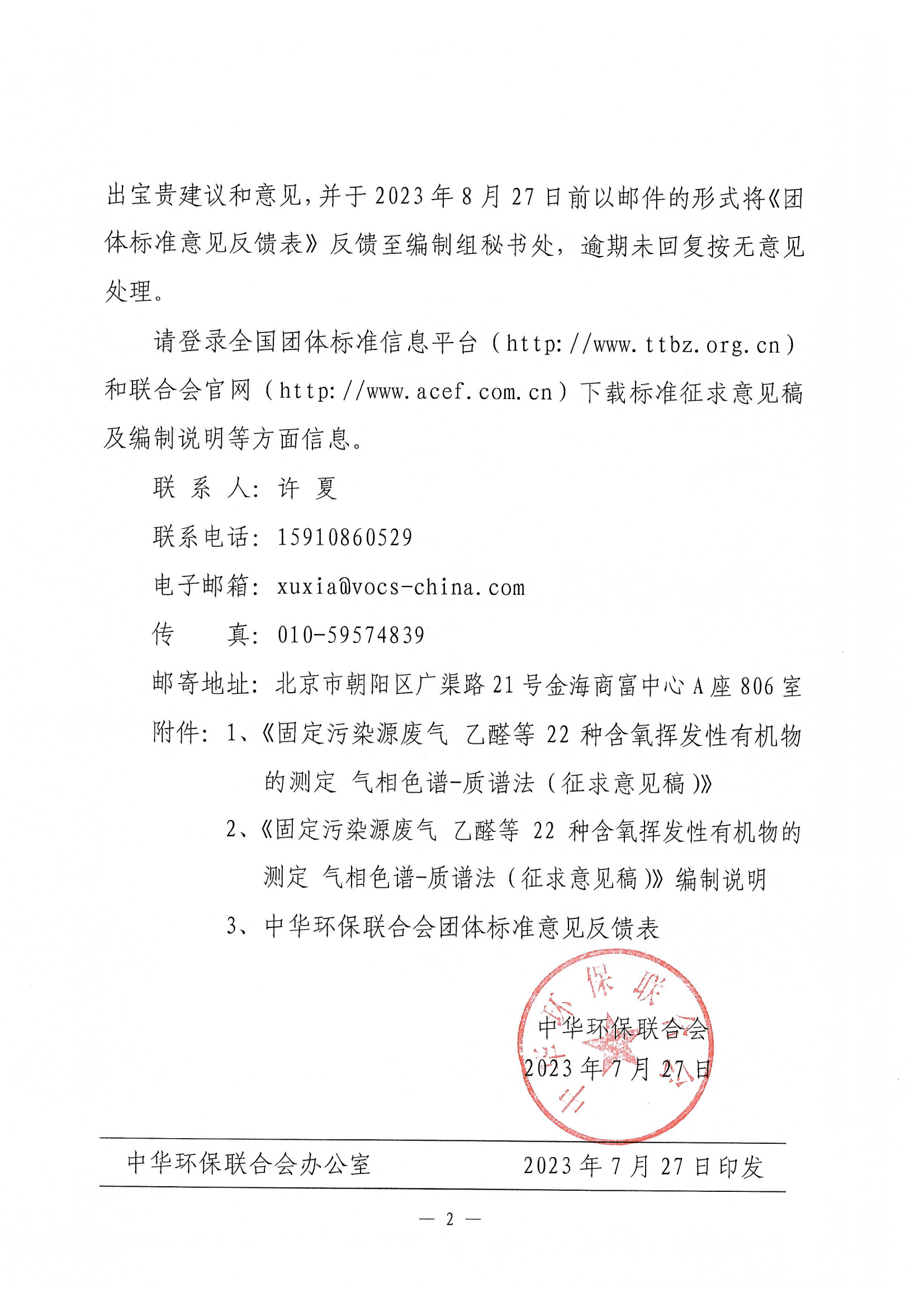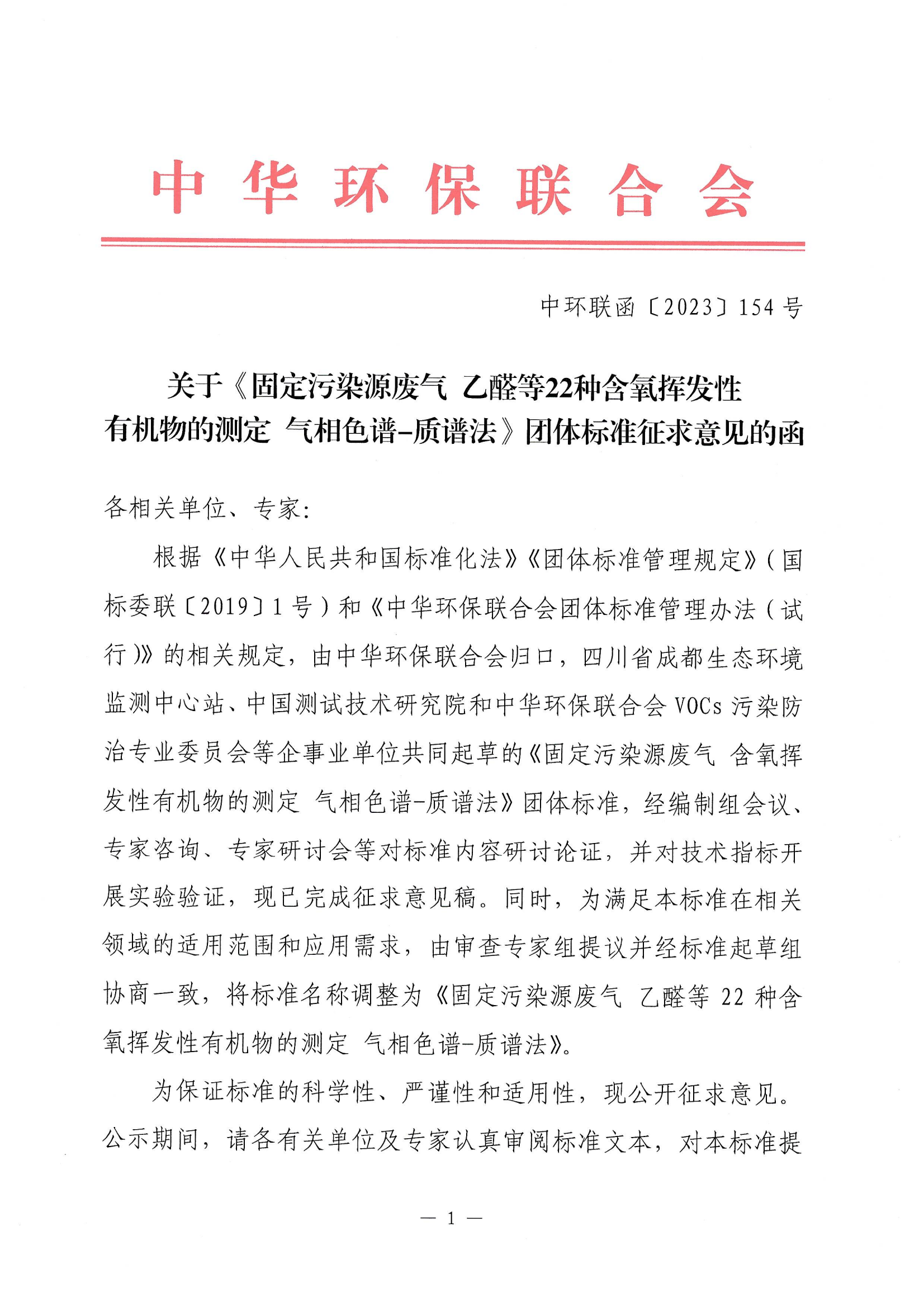 关于 《固定污染源废气 乙醛等22种含氧挥发性有机物的测定 气相色谱-质谱法》团体标准征求意见的函