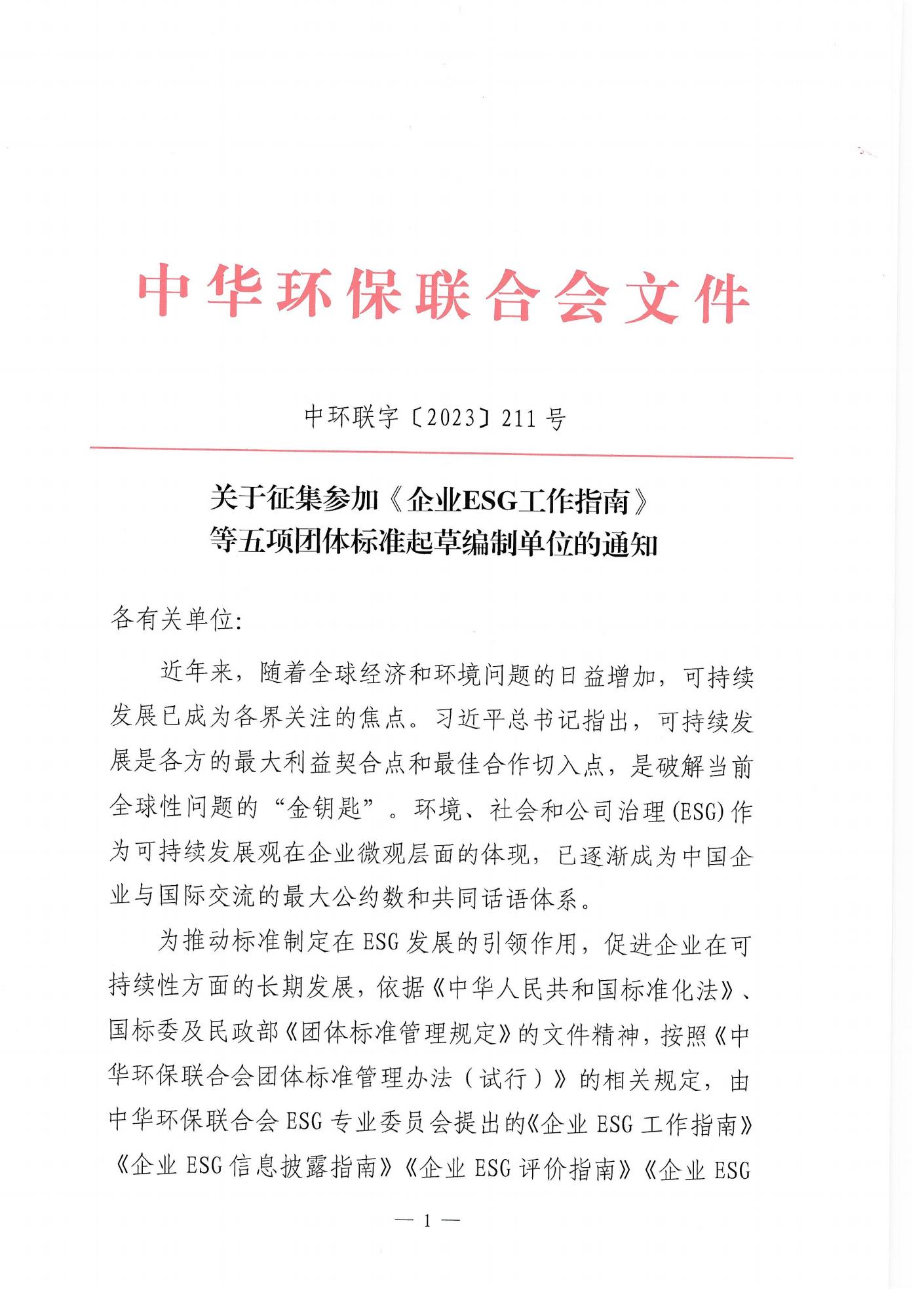 关于征集参加《企业ESG工作指南》等五项团体标准起草编制单位的通知