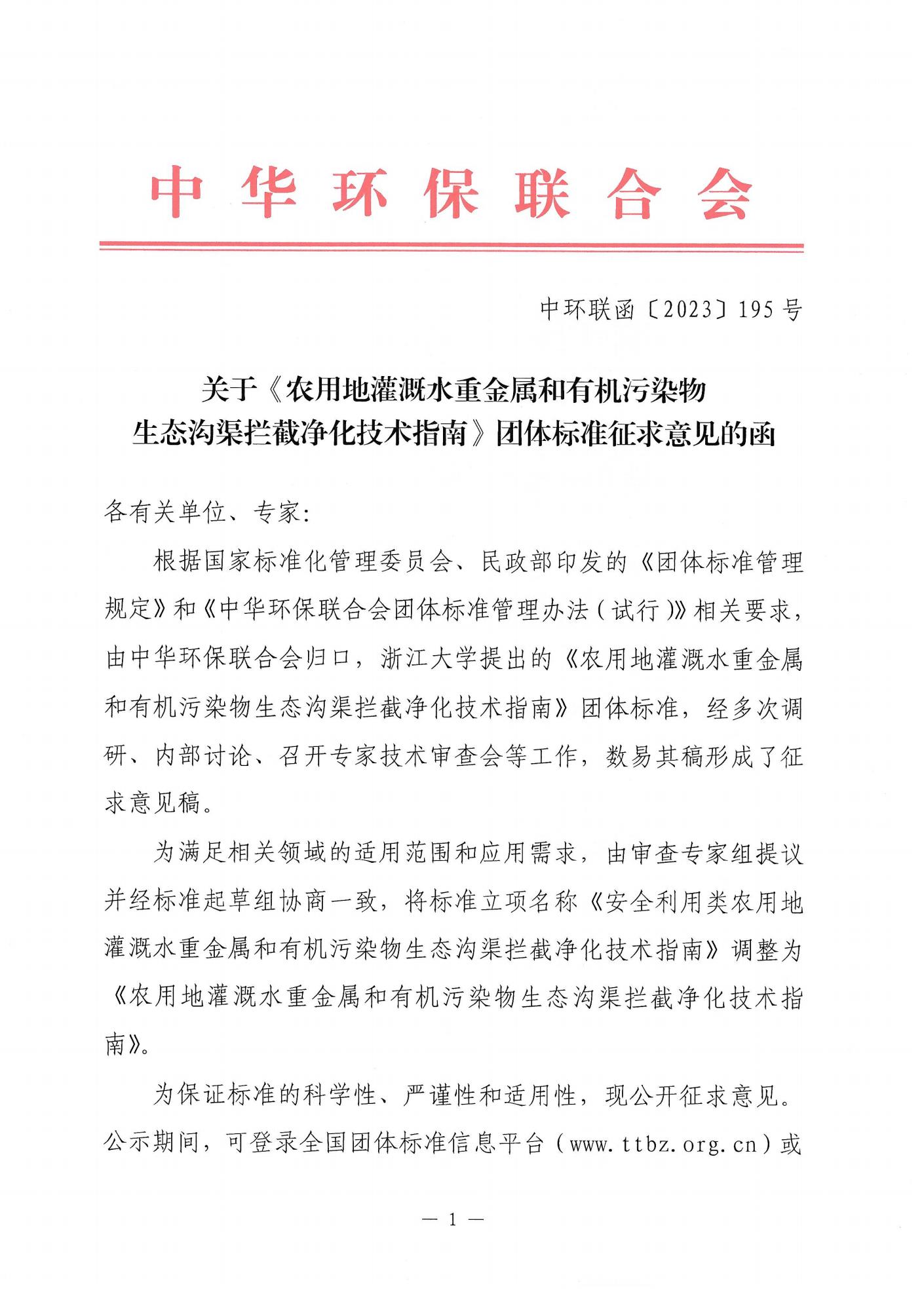 关于《农用地灌溉水重金属和有机污染物生态沟渠拦截净化技术指南》团体标准征求意见的函