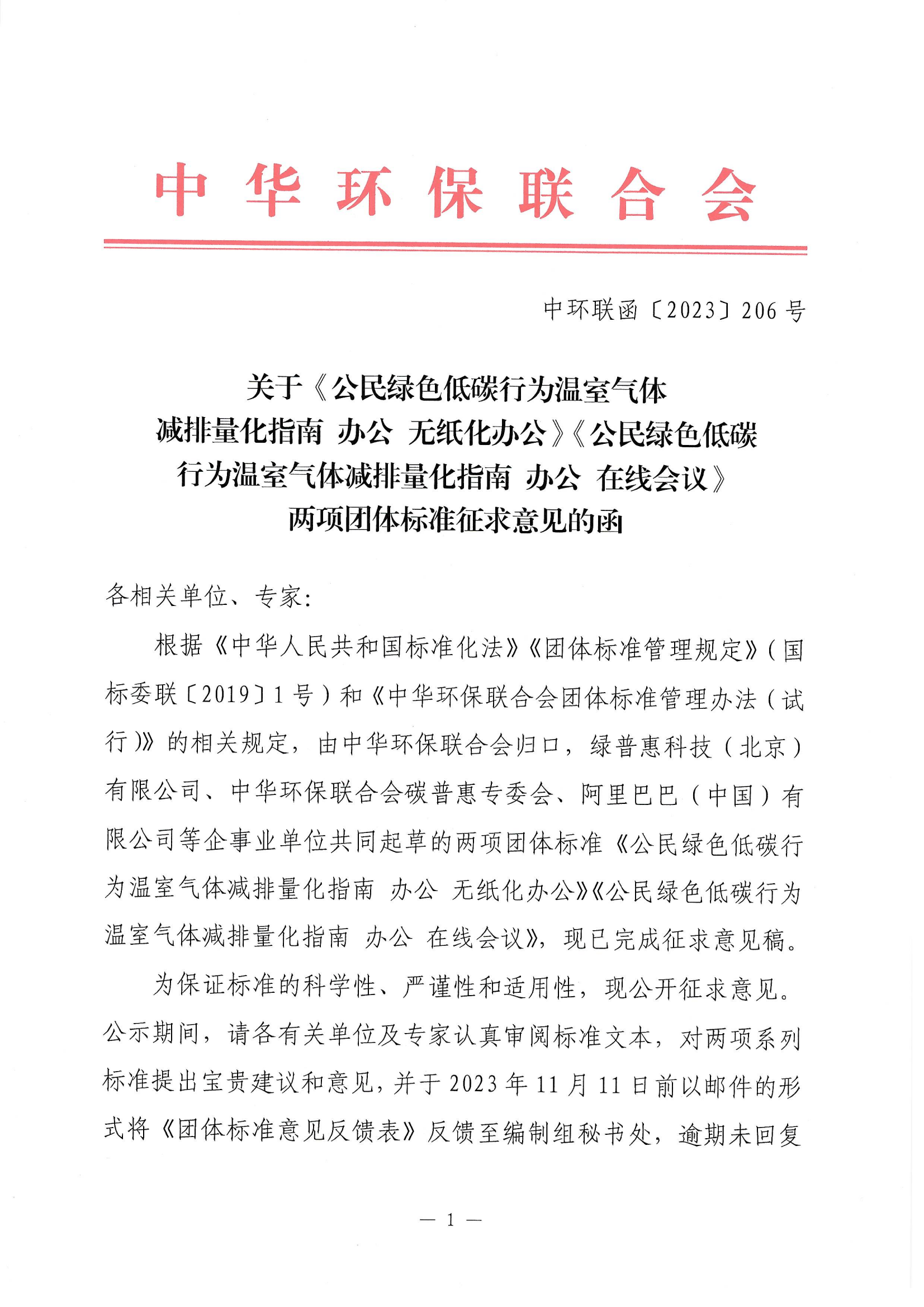 关于《公民绿色低碳行为温室气体减排量化指南 办公 无纸化办公》《公民绿色低碳行为温室气体减排量化指南 办公 在线会议》两项团体标准征求意见的函
