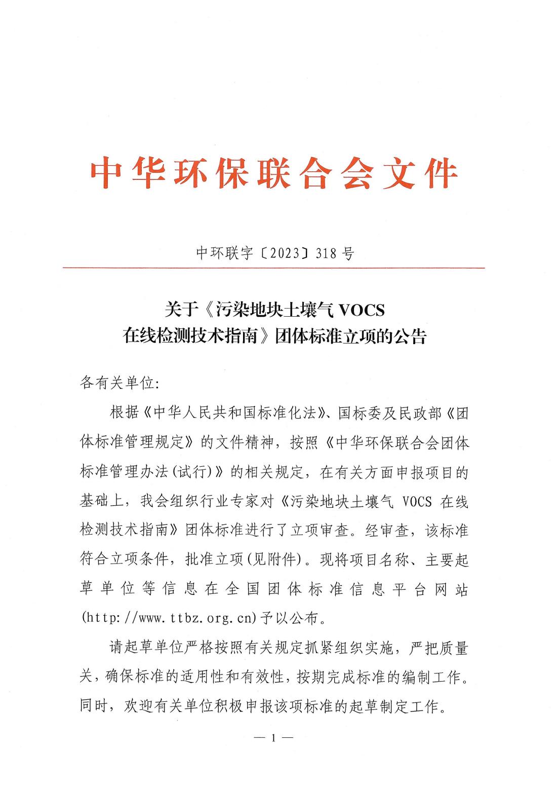 关于《污染地块土壤气VOCS在线检测技术指南》团体标准立项的公告