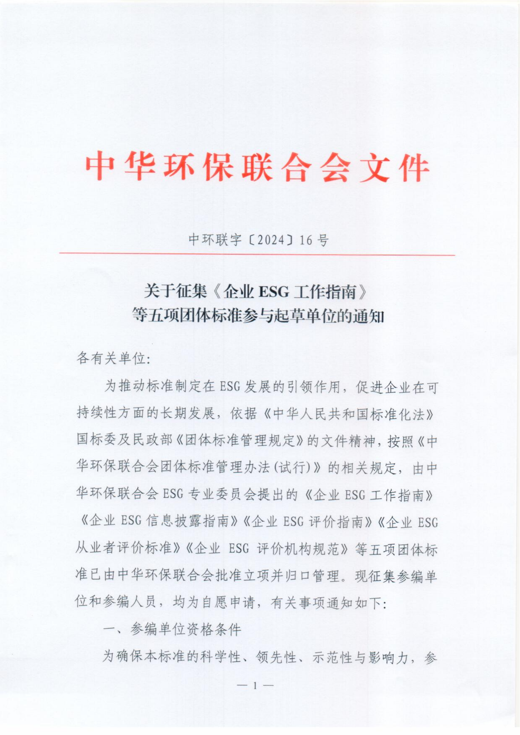 关于征集《企业ESG工作指南》等五项团体标准参与起草单位的通知