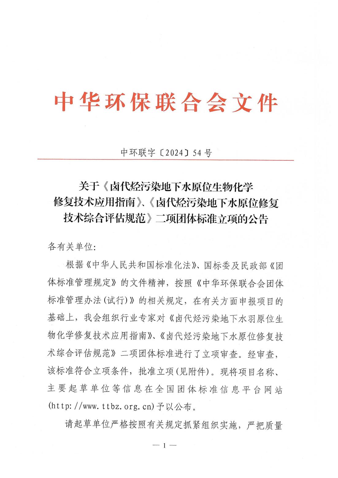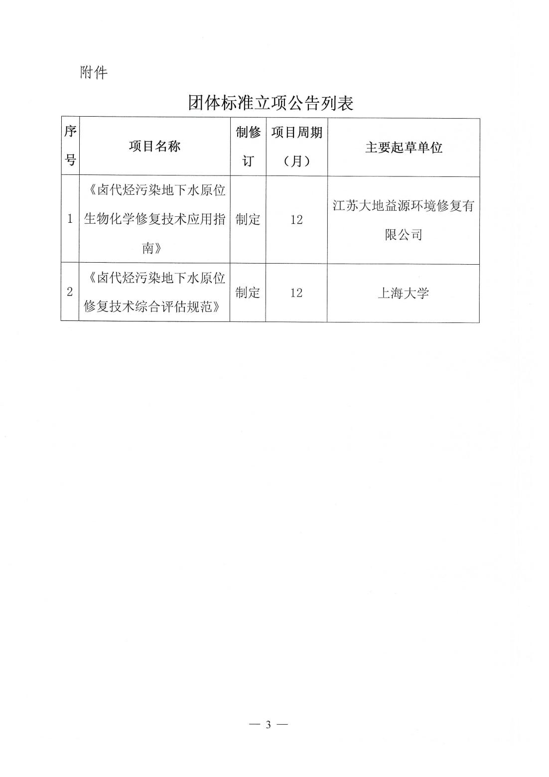 关于《卤代烃污染地下水原位生物化学修复技术应用指南》、《卤代烃污染地下水原位修复技术综合评估规范》二项团体标准立项的公告
