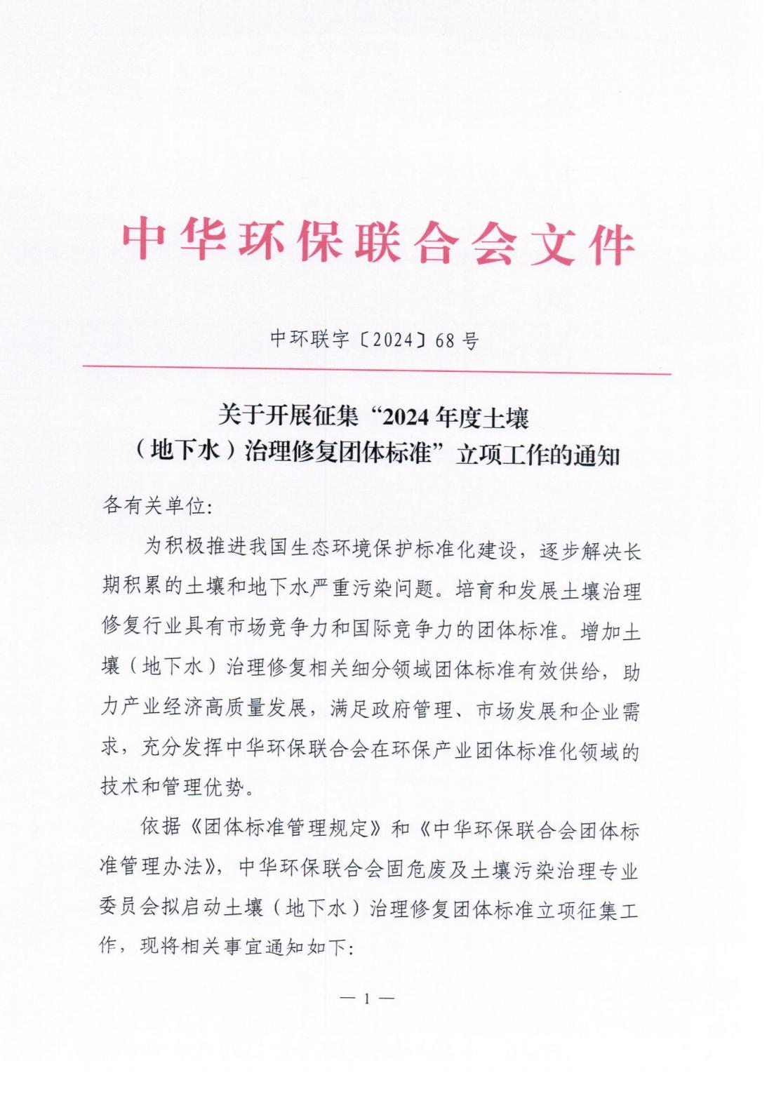 关于开展征集“2024年度土壤(地下水)治理修复团体标准”立项工作通知