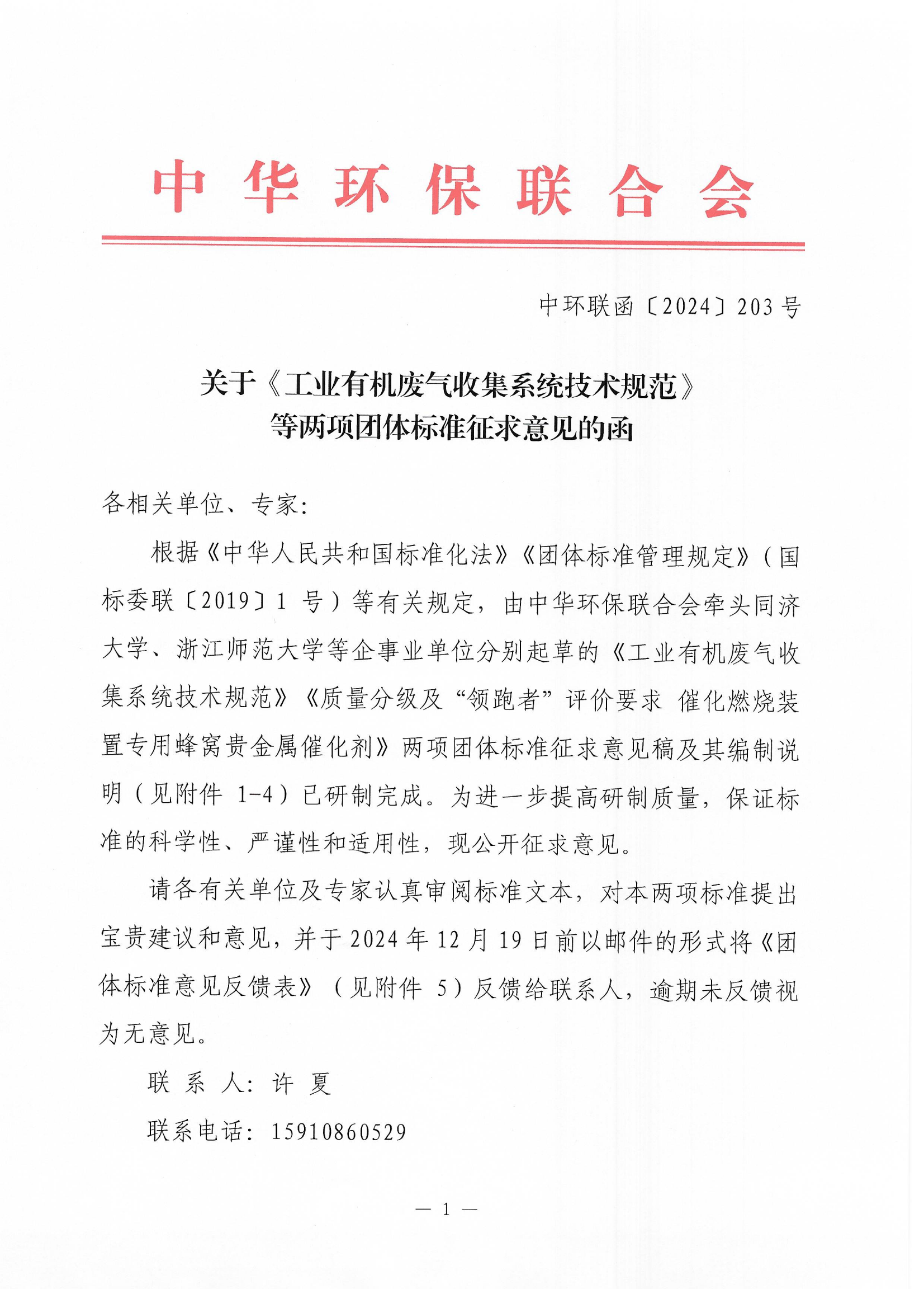 关于《工业有机废气收集系统技术规范》等两项团体标准征求意见的函 |