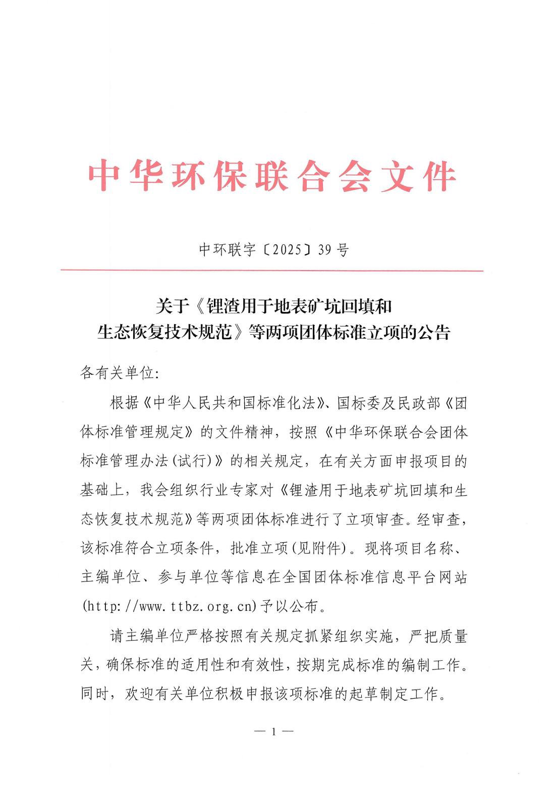 关于《锂渣用于地表矿坑回填和生态恢复技术规范》等两项团体标准立项的公告