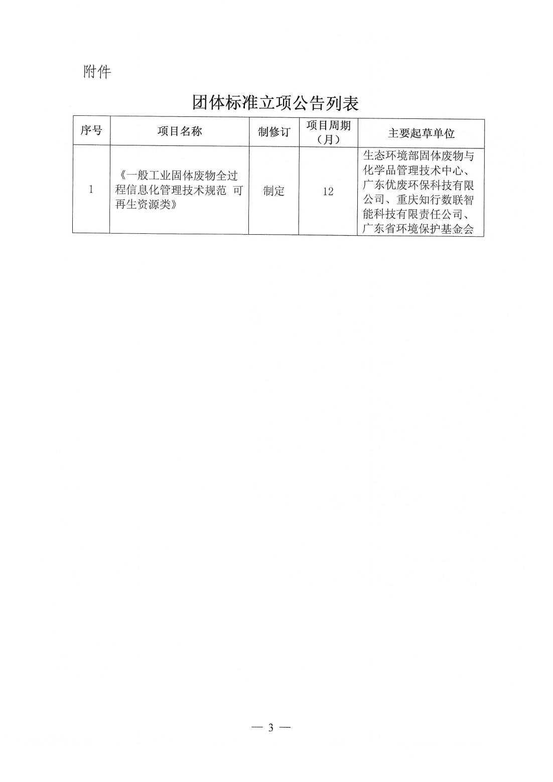 关于《一般工业固体废物全过程信息化管理技术规范 可再生资源类》团体标准立项的公告