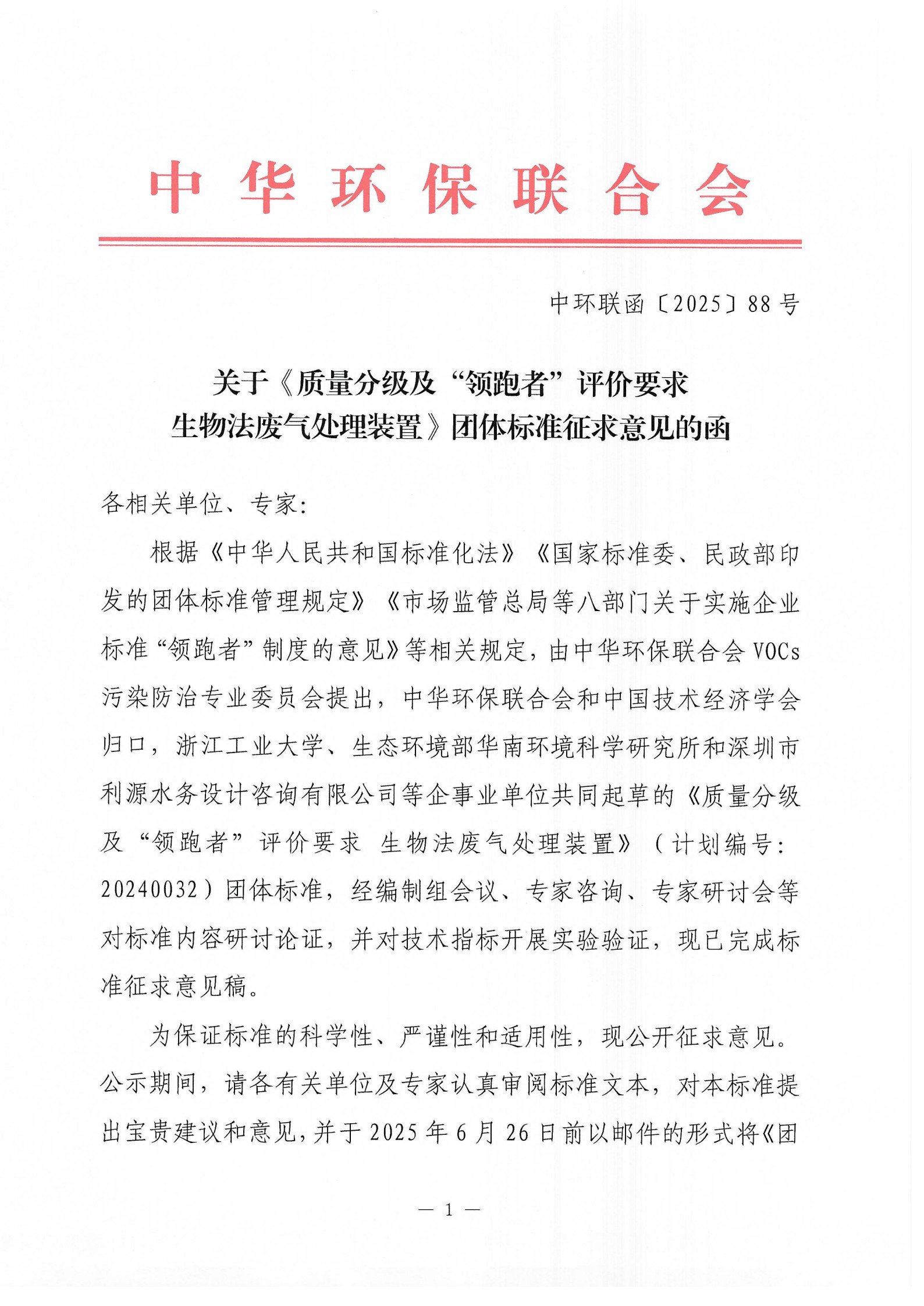关于《质量分级及“领跑者”评价要求 生物法废气处理装置》团体标准征求意见的函