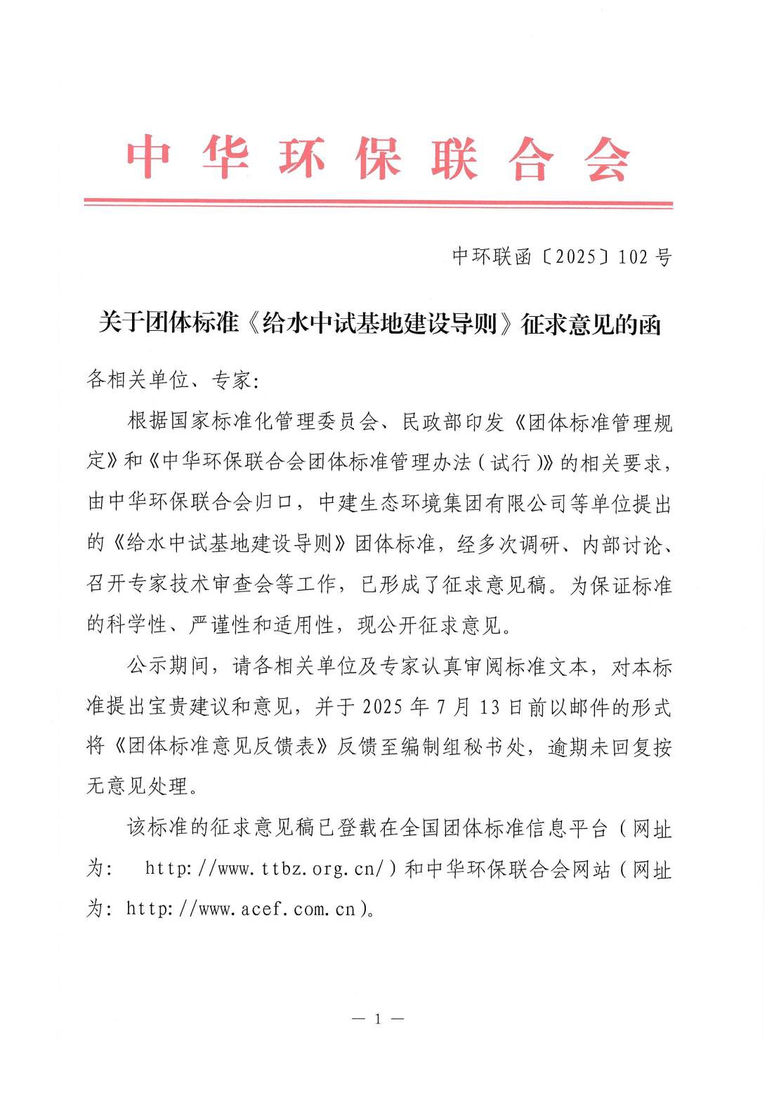 关于团体标准《给水中试基地建设导则》征求意见的函