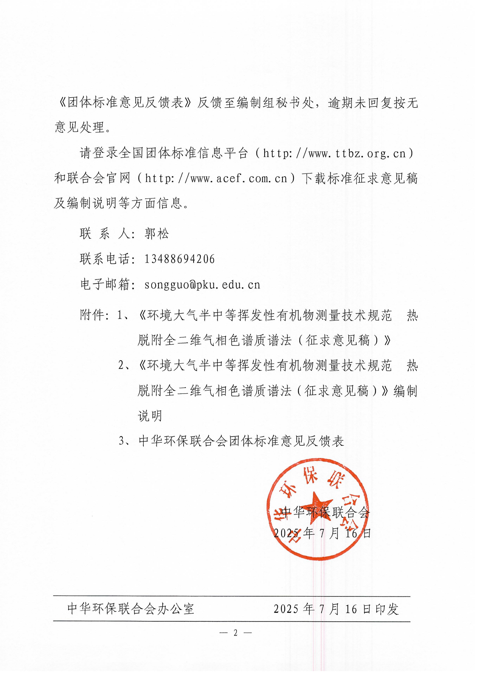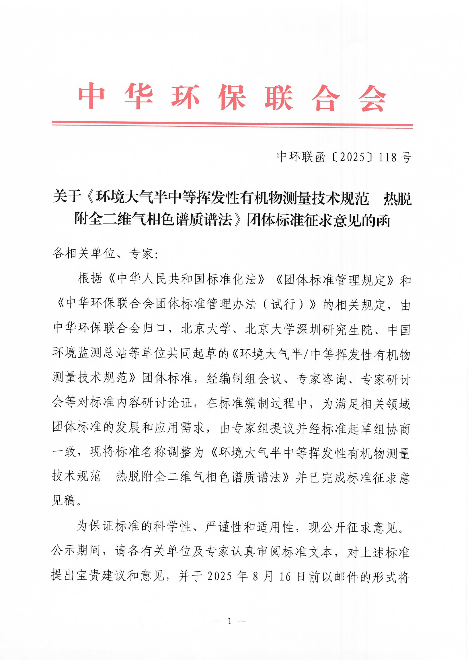 关于《环境大气半中等挥发性有机物测量技术规范 热脱附全二维气相色谱质谱法》团体标准征求意见的函