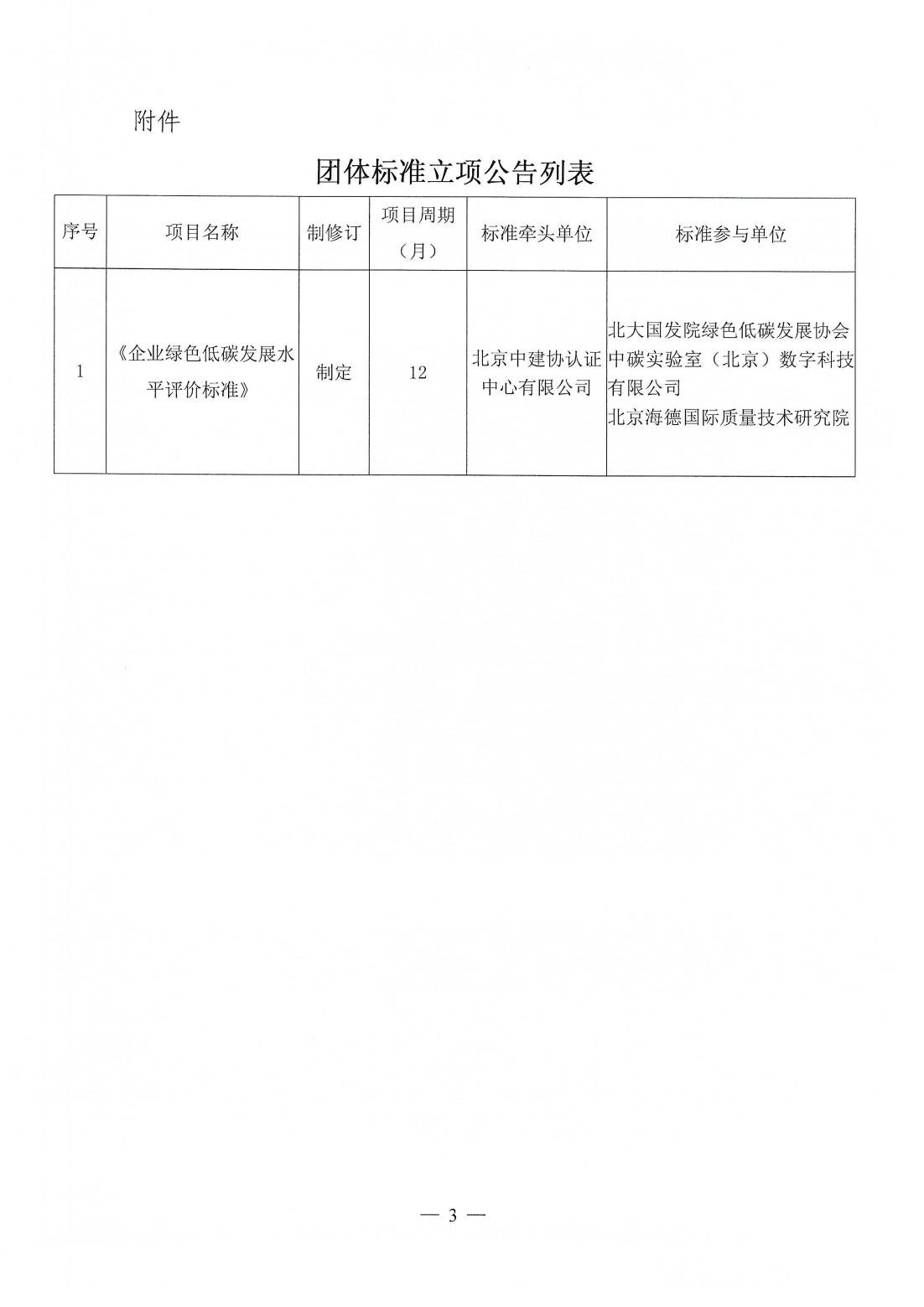 关于《企业绿色低碳发展水平评价标准》团体标准立项的公告