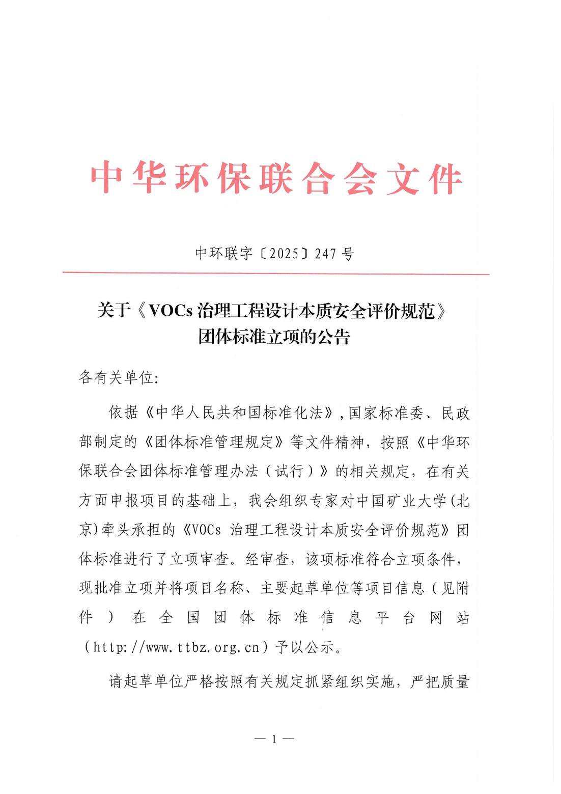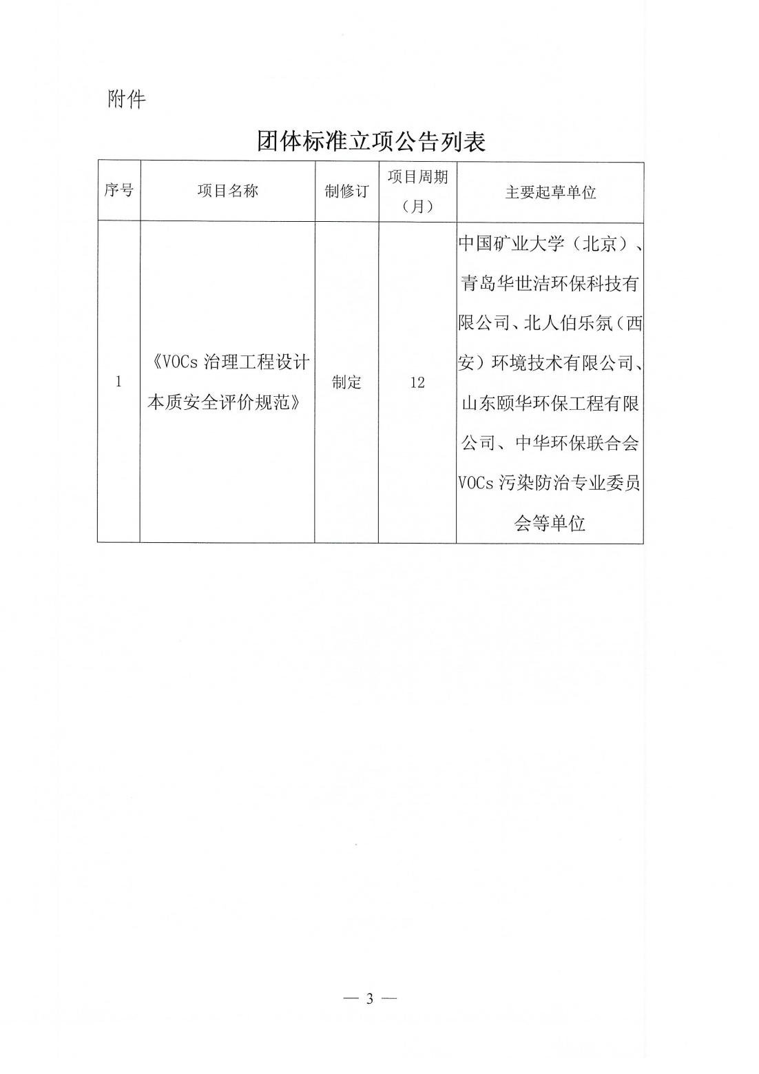 关于《VOCs治理工程设计本质安全评价规范》团体标准立项的公告