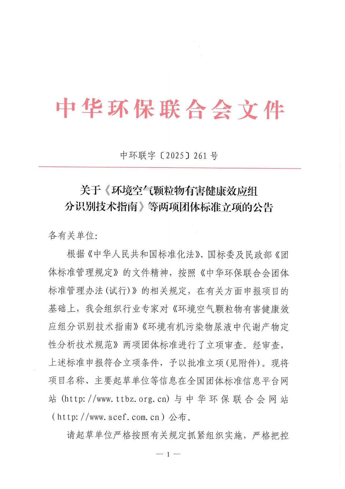 关于《环境空气颗粒物有害健康效应组分识别技术指南》等两项团体标准立项的公告