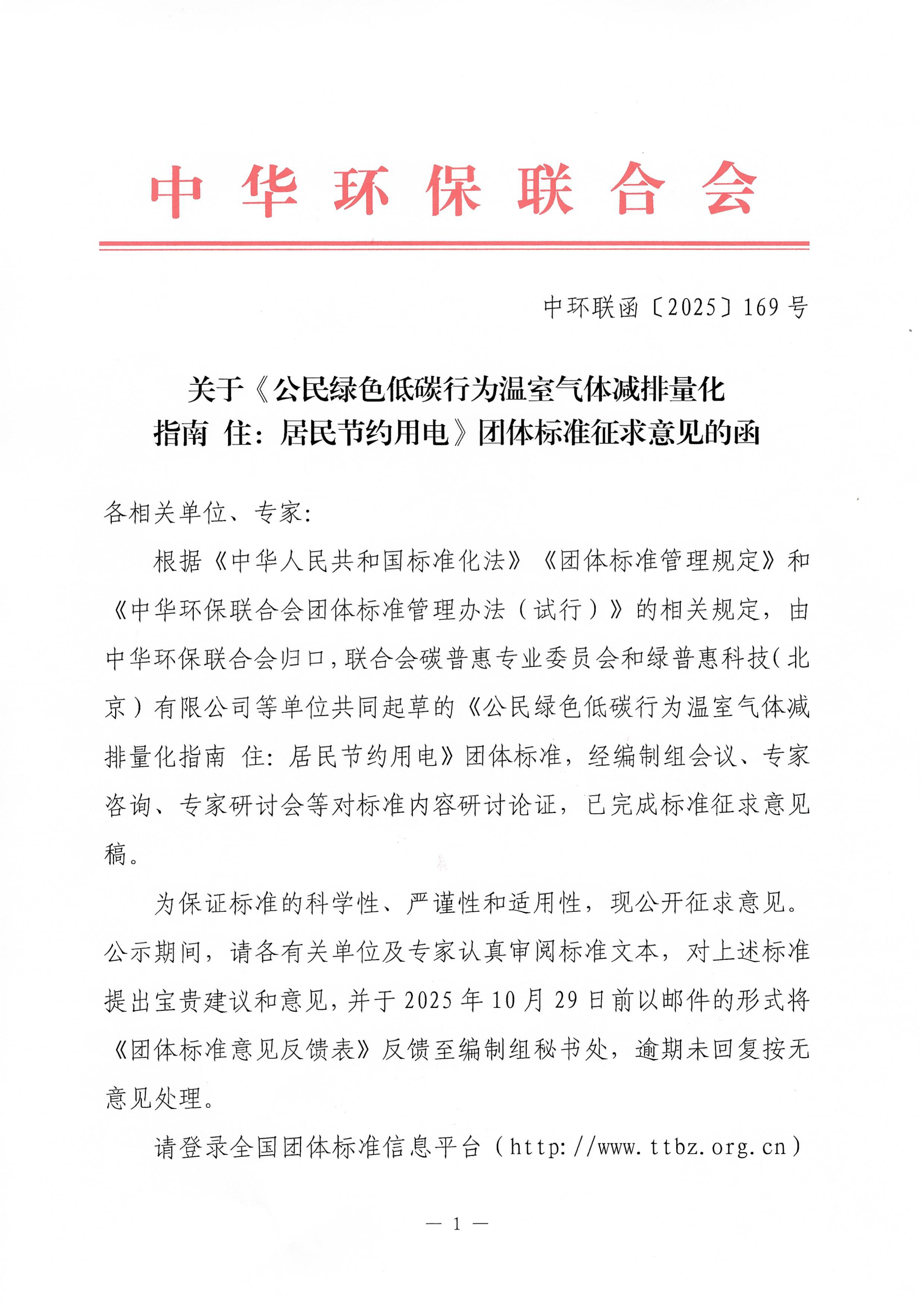 关于《公民绿色低碳行为温室气体减排量化指南 住:居民节约用电》团体标准征求意见的函
