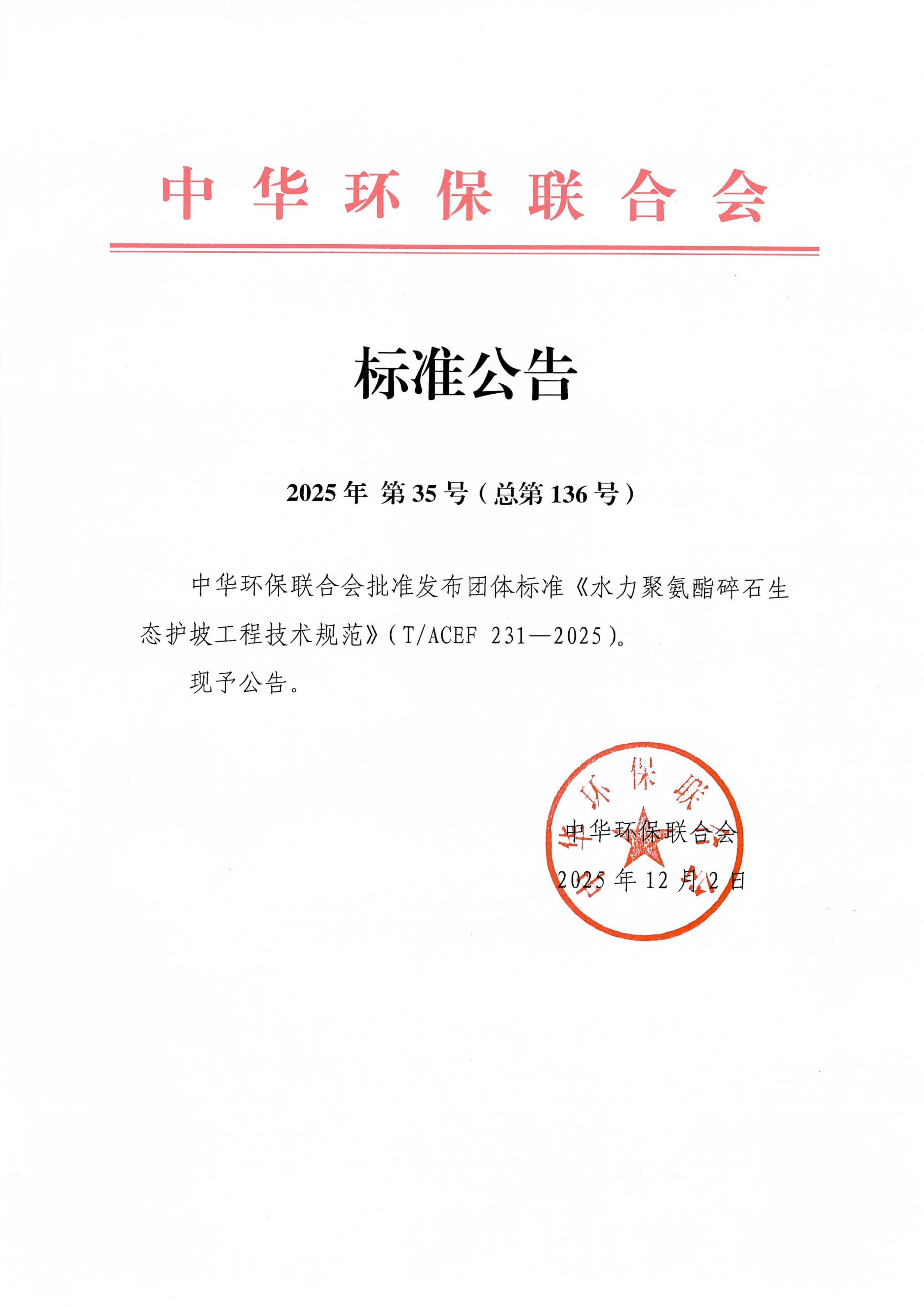 中华环保联合会批准发布团体标准《水力聚氨酯碎石生态护坡工程技术规范》的公告
