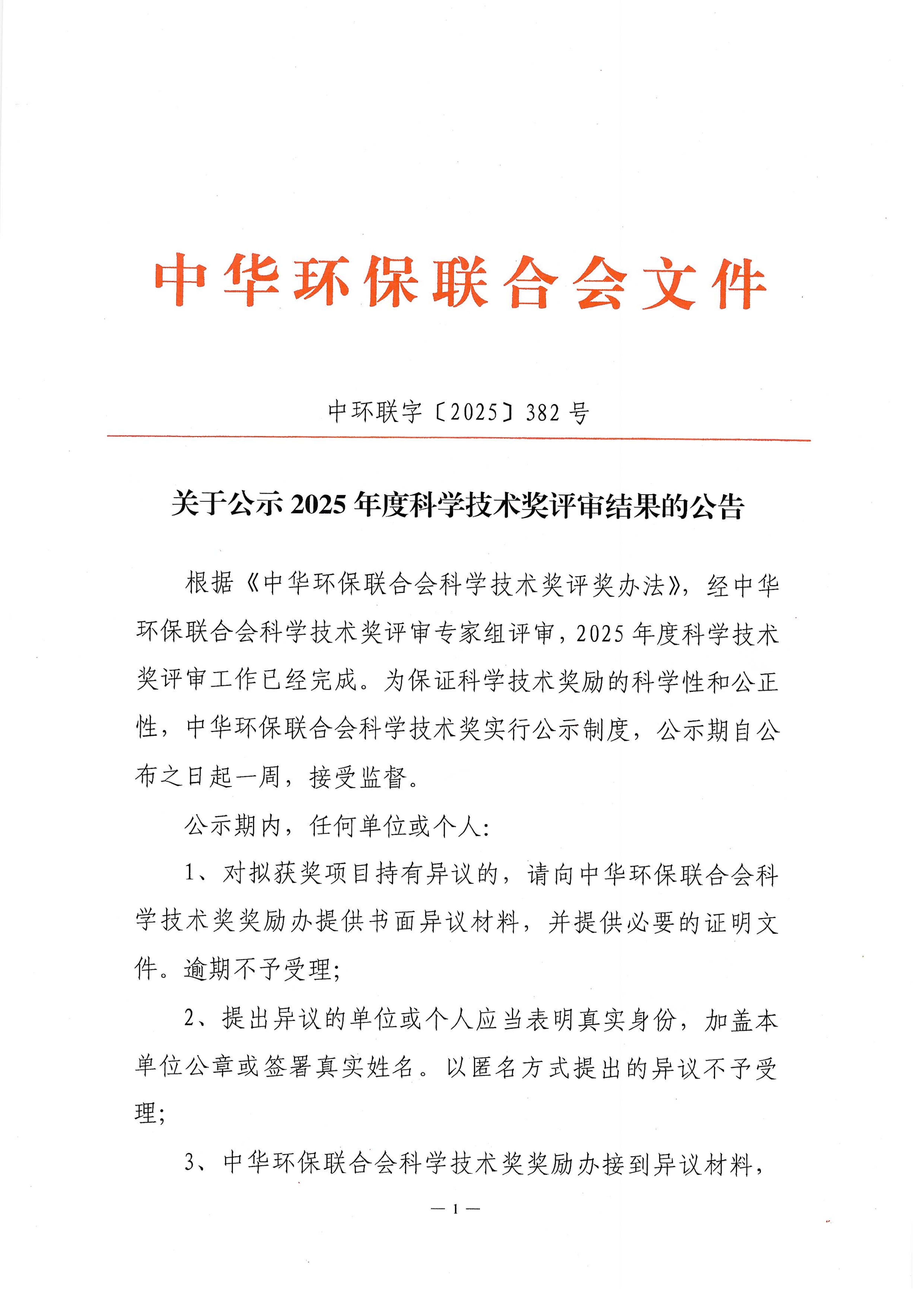 关于开展 2025年度中华环保联合会