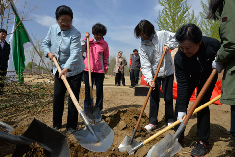顾秀莲委员长、谢玉红副秘书长、张素枝副县长、盛桂荣副主任正在植树