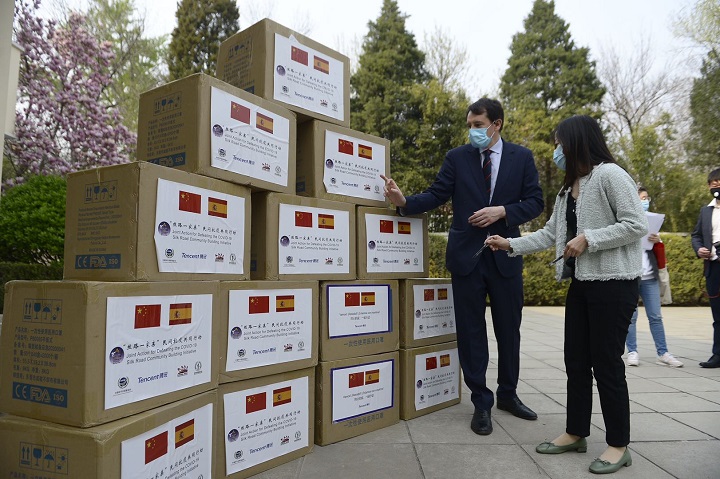 2020年3月31日下午,“丝路一家亲”民间抗疫共同行动西班牙防疫物资交接仪式在京举行。西班牙驻华大使德斯卡利亚尔、中国和平发展基金会副秘书长王华、腾讯慈善基金会公共事务总监张海若、中华环保联合会副秘书长李瑞东等出席仪式。此次活动由中国民间组织国际交流促进会(简称“中促会”)发起,腾讯科技(深圳)有限公司支持,中国和平发展基金会主办,中华环保联合会参与执行。