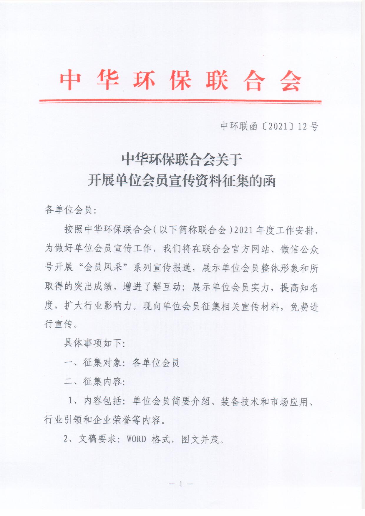 中华环保联合会关于开展单位会员宣传资料征集的函