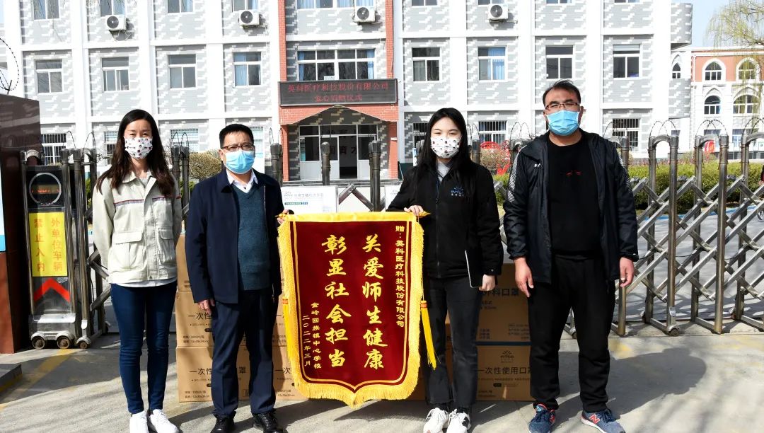 ▲英科医疗向淄博市临淄区金岭镇中心学校捐赠抗疫物资