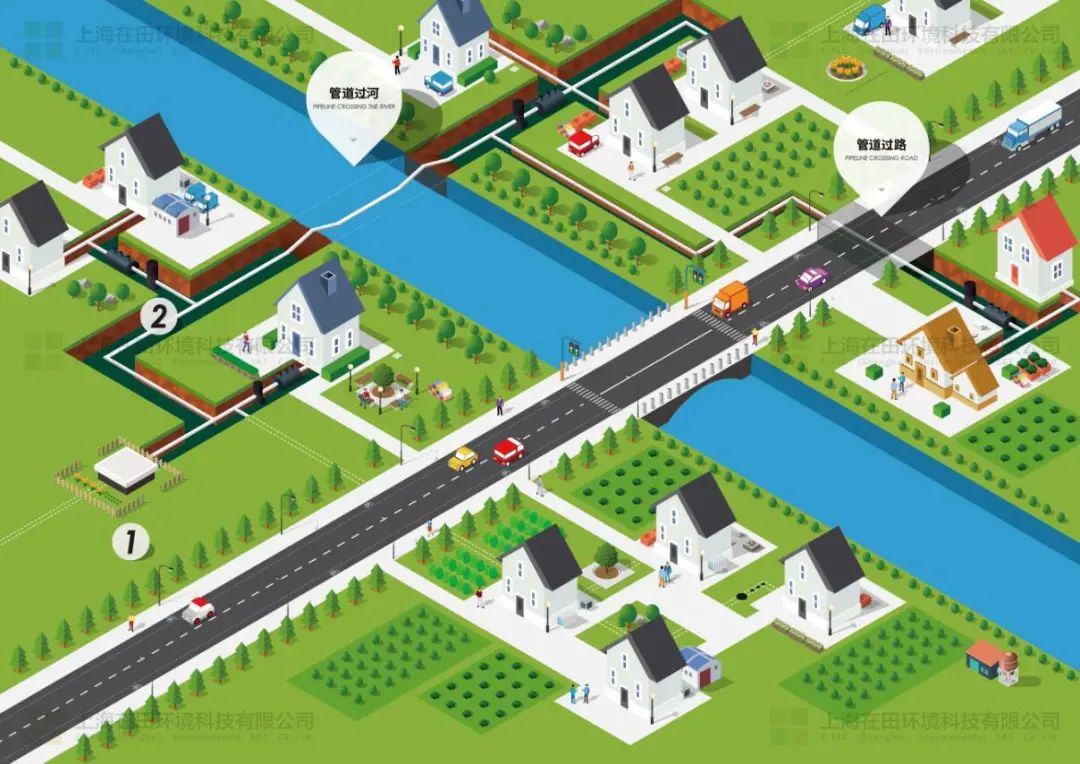 3、居住区房屋分散地区:针对“居住区房屋分散、户均排水管线过长”的村镇污水排放,管径小(满管流)、沿线无需设置检查井,无需管道清淤。使用单相流负压排水系统可降低一部分投建费用、运维费用。