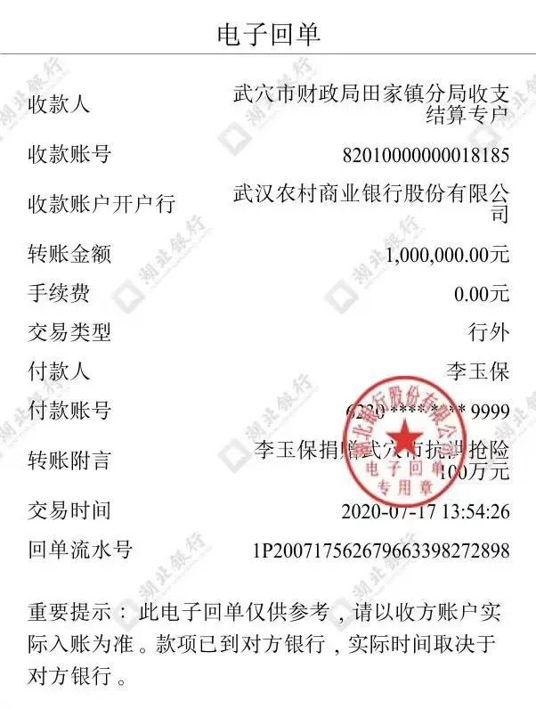 2020年7月,运鸿集团董事局主席李玉保向武穴田镇办事处捐赠100万元,运鸿集团向武穴市11个防汛点捐赠价值5万元的抗洪物资,助力武穴市抗洪救灾工作。