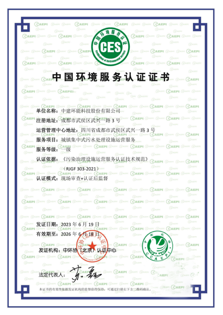 中国环境服务城镇集中式污水处理设施运营服务认证证书分为一级、二级、三级三个级别,其中一级认证对企业业绩、人员要求的标准最高。根据《城镇集中式污处理设施运营服务认证实施规则》(CCAEPI-RG-ES-004-2021)的相关内容,中建环能完全符合一级认证中的人员和业绩要求,具备开展运营服务所必需的人员、营业场所等资源和基础设施,有完善的运营服务质量管理体系,可确保运营服务高质量运作。