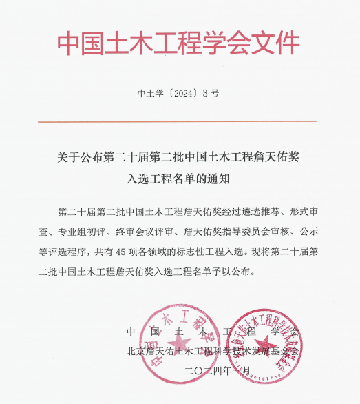 据悉,中国土木工程詹天佑奖是经中共中央、国务院同意,科技部核准、住房和城乡建设部认定,以推动土木工程行业科技创新与进步为宗旨的科技奖项,是我国土木工程领域工程建设项目科技创新的最高荣誉奖。