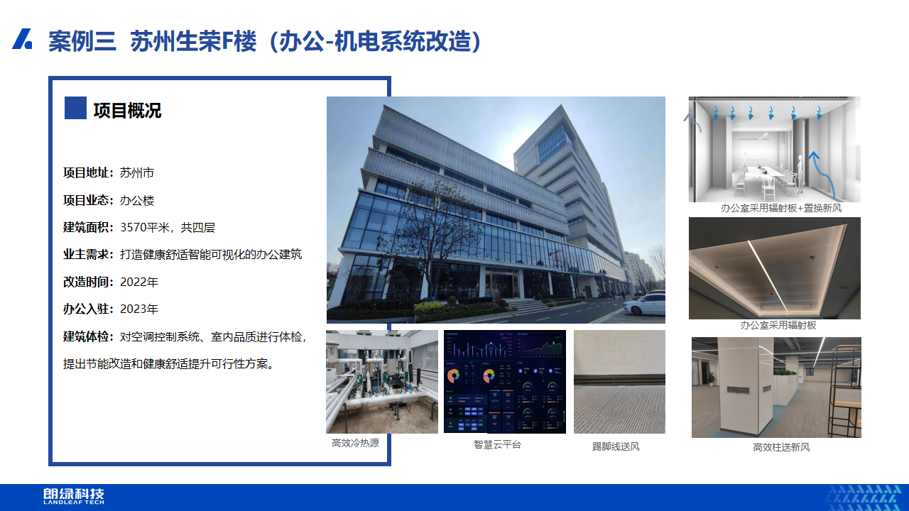 该项目属于改造办公建筑,对空调控制系统、室内品质进行体检,提出节能改造和健康舒适提升可行性方案。朗绿科技运用建筑性能优化、温湿度独立控制、高效新风及智慧控制等绿色技术,助力项目成为健康舒适,智能可视化的办公建筑。