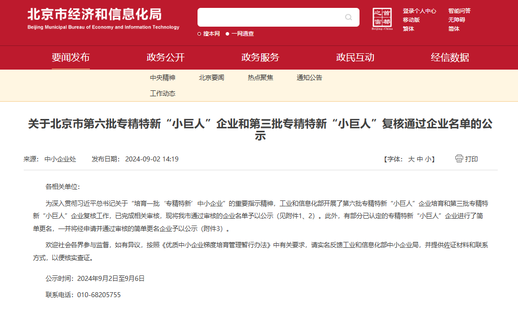 近日,工业和信息化部及北京市经济和信息化局公布第六批专精特新“小巨人”名单,中科环保成功入选,被评为国家级专精特新“小巨人”。