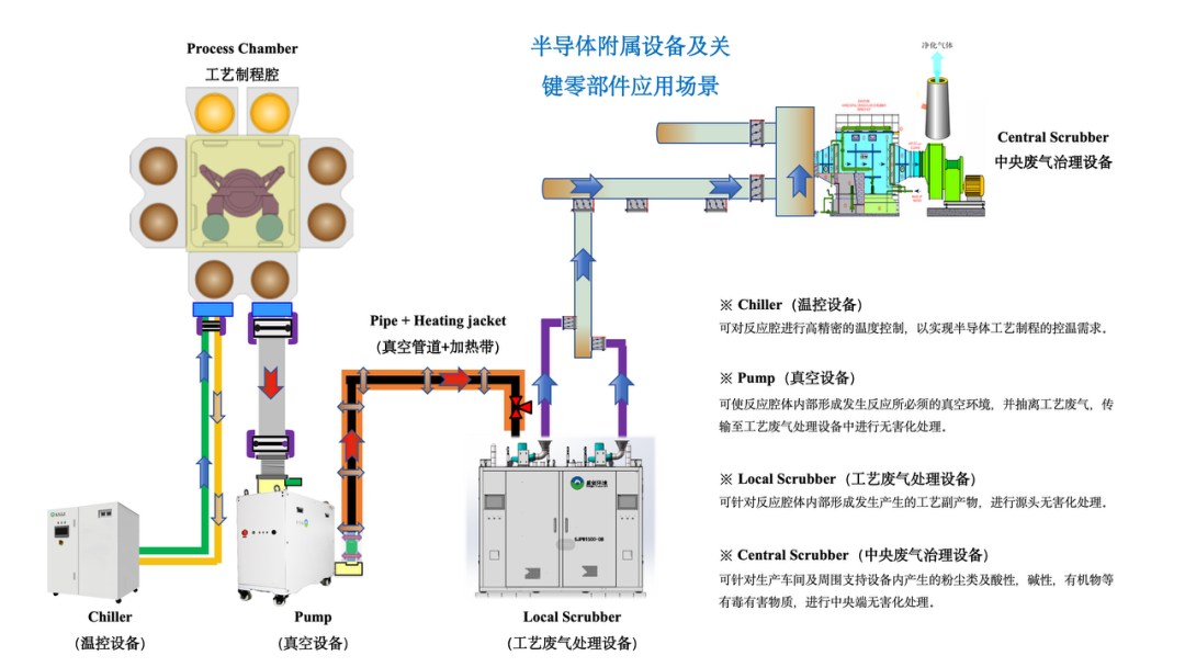 项目规划产品工艺废气处理设备、真空设备、温控设备。这些产品共同作用于对半导体制程设备反应腔的辅助控制,可使反应腔满足刻蚀、离子注入、扩散及薄膜沉积等工艺所需的环境条件,是半导体制程中不可或缺的重要组成部分。