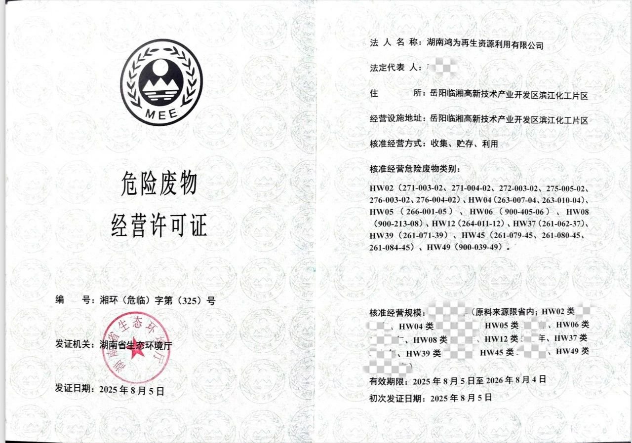 湖南鸿为再生资源利用有限公司(简称“湖南鸿为”)2025年8月5日正式获颁湖南省生态环境厅核发的《危险废物经营许可证》(湘环(危临)字第(325)号)。这标志着岳阳临湘20000吨/年活性炭“再生绿岛”项目全面具备合法运营资质并投入运行,将为区域企业提供废活性炭处置“一站式”解决方案,强力助推绿色低碳发展。