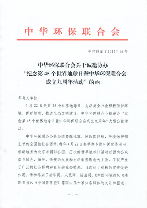 中华环保联合会关于诚邀协办“纪念第45个世界地球日暨中华环保联合会成立九周年活动”的函