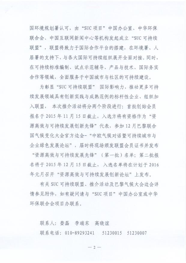 中华环保联合会关于参加巴黎联合国气候变化大会边会及“SUC联盟暨资源高效可持续发展创新先锋”推介的通知